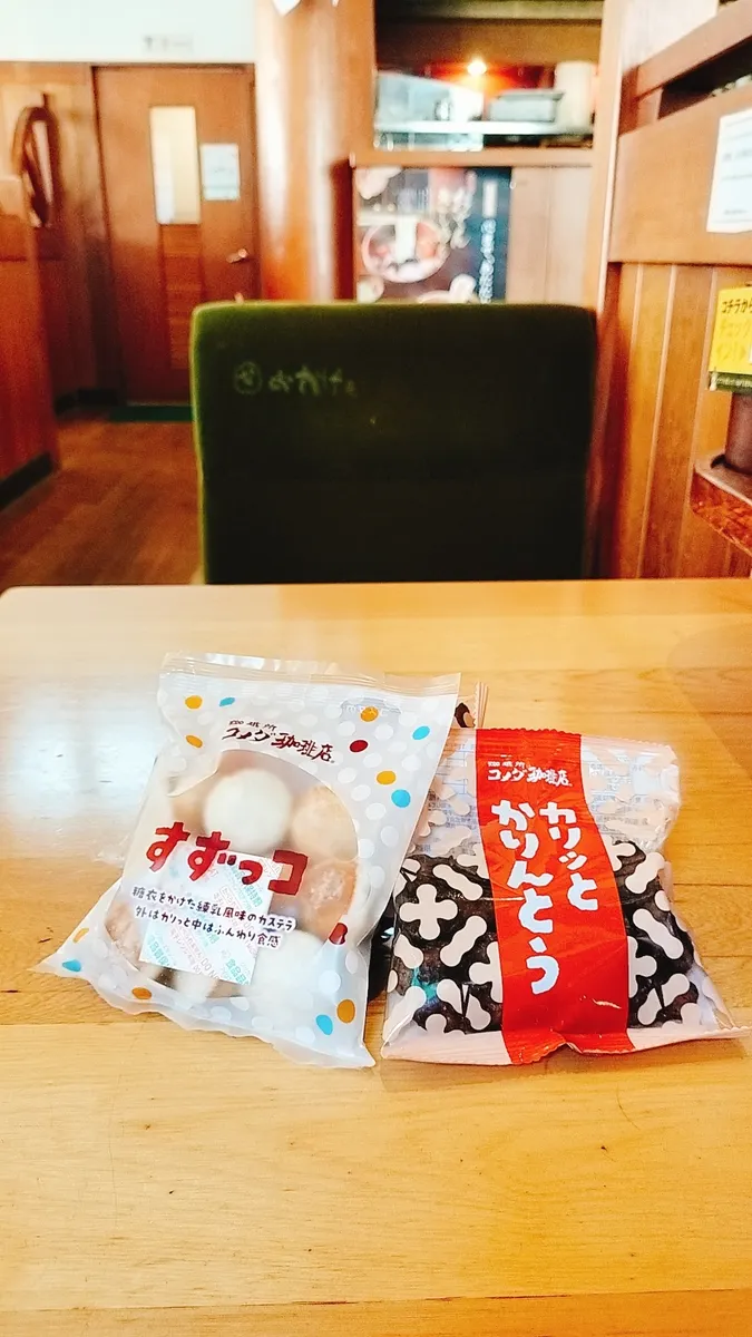 とりあえずモーニングをオーダーして、待っている間にコメダのレジ周りで見つけたかりんとうと、すずっコをおかげ庵で撮影📸