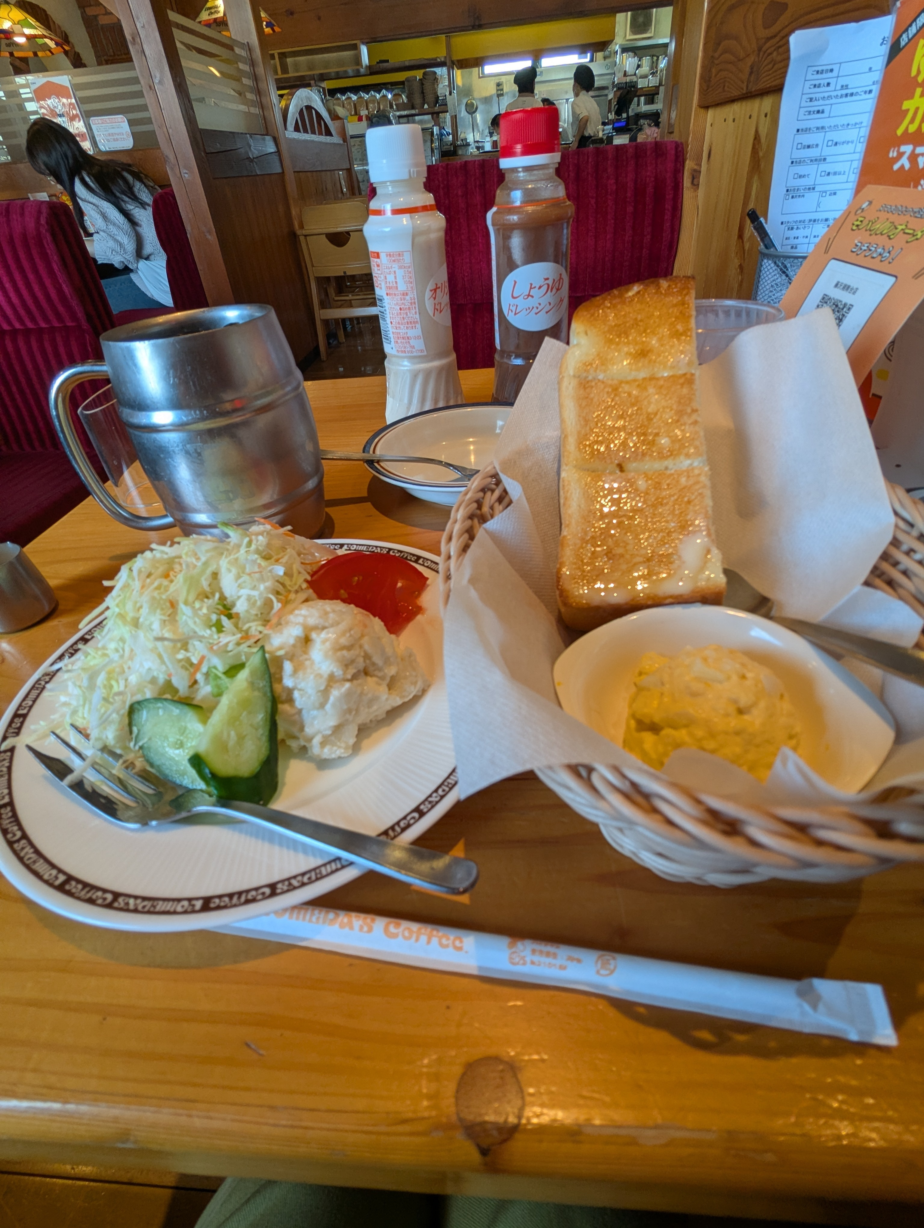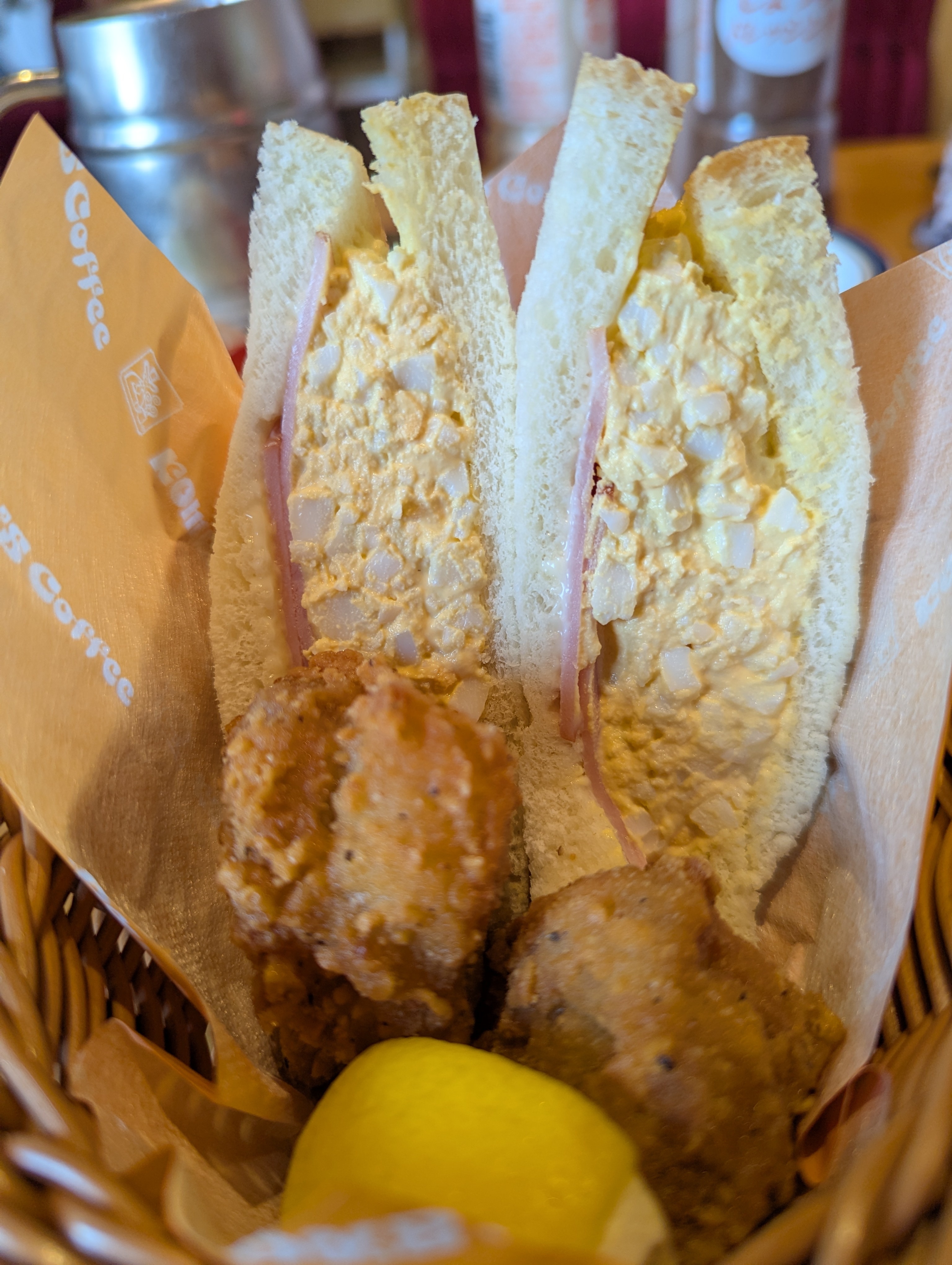 バターたっぷりトーストのモーニングに、たまごペーストギッシリのミニコメバスケット、美味しそうです🥰