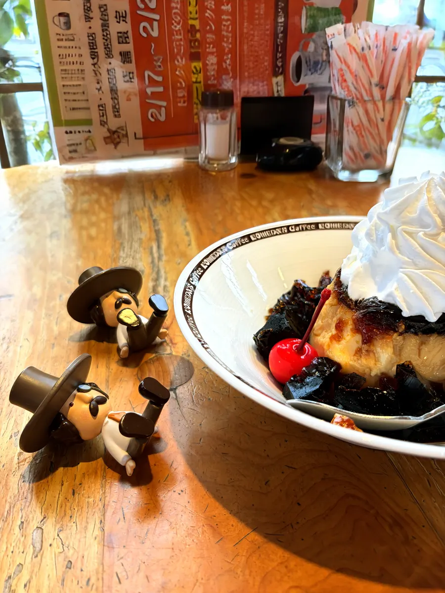 お待ち兼ねの珈琲所のプリン🍮ホイップの形が立派なだけに🍒落下は⤵️ですね