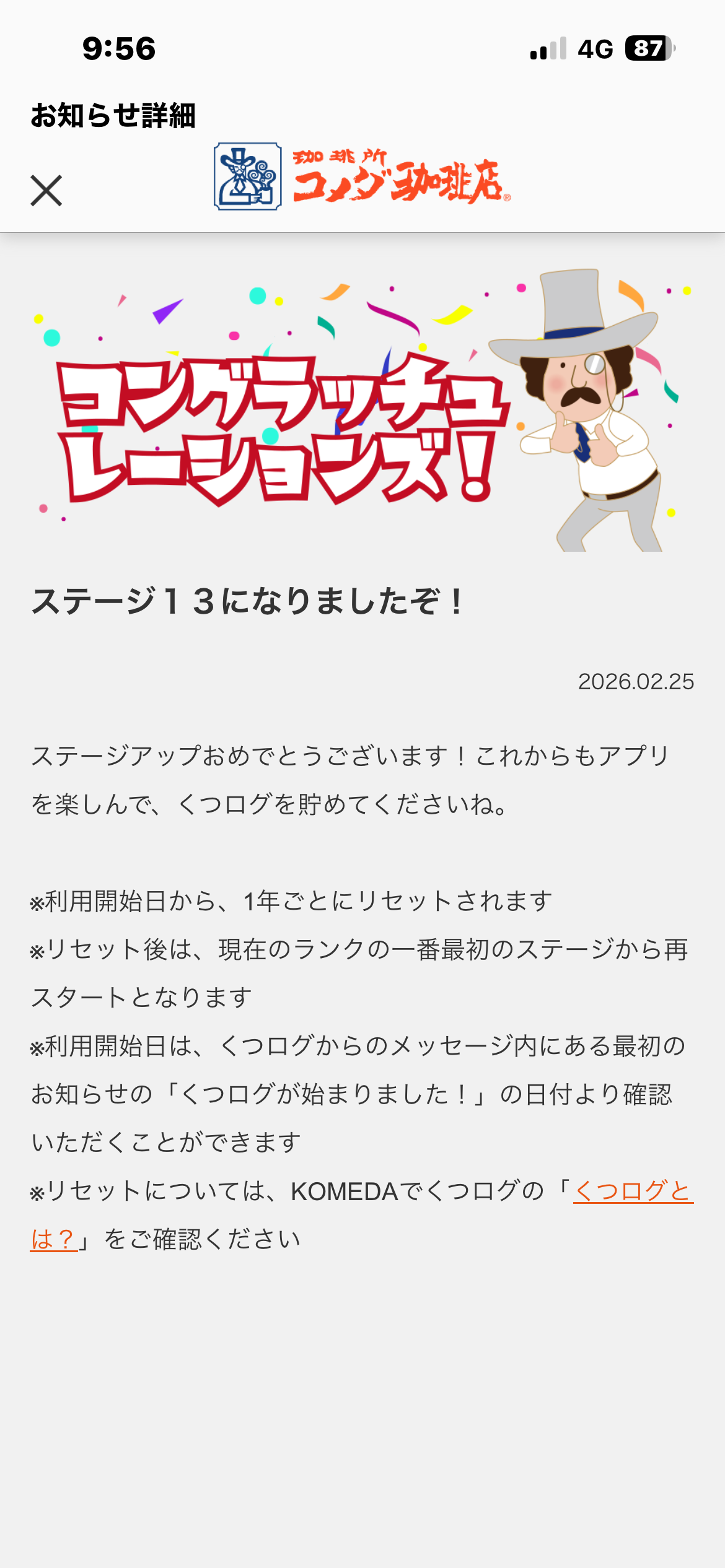 トップ > コメダ写真館 > コメダ珈琲店アプリいじっていたら たぁーにゃん 2026/02/25 09:59 コメダ珈琲店アプリいじっていたら アプリ開いていじっていたら知らない間に ランクアップしていました ビックリ((((;゚Д゚)))) いいね 共有する 共有する X facebook LINE リンクをコピー コメントする 3 件の返信 (新着順) ミュートしたユーザーの投稿です。 投稿を表示 おぶんぐ 2026/02/26 09:40 たぁーにゃんさん、こんにちは。 ステージ13にステップアップ✴️ 🎉おめでとうございます🎉 素敵なくつろぎ時間をお過ごし下さいね♪ いいね 返信する ミュートしたユーザーの投稿です。 投稿を表示 いちじく 2026/02/25 23:52 たぁーにゃん たぁーにゃんさん🎉ステージ13おめでとうございます👏 いいね 返信する ミュートしたユーザーの投稿です。 投稿を表示 うさごん 2026/02/25 22:12 たぁーにゃん たぁーにゃんさん、こんばんは😃。 🎉㊗️ステージ13にステージアップ ✨おめでとうございます🎉🎉🎉✨ 明日も素敵💓な一日をお過ごしください🥰💕。 いいね 返信する