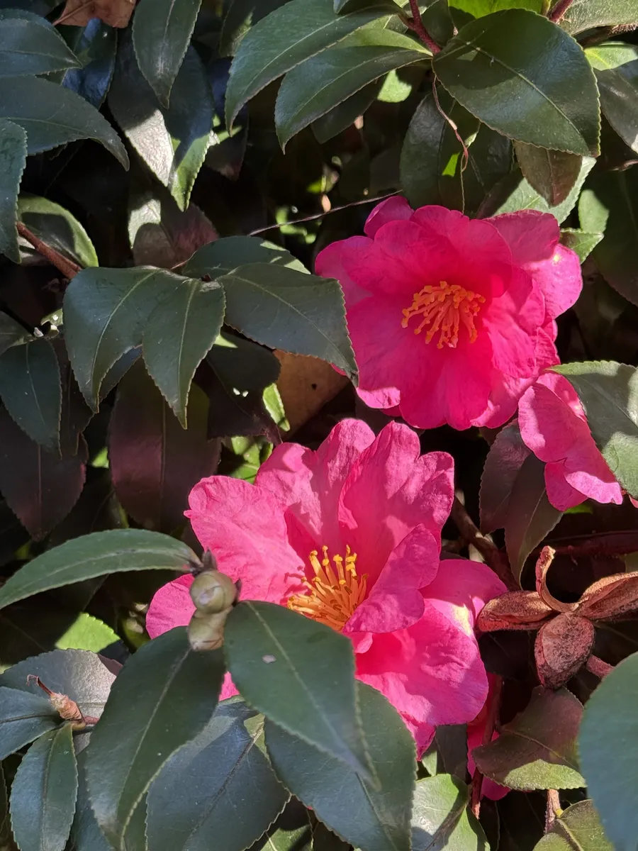濃いピンク🩷のサザンカは多分王道の昔ながらの品種みたいです🌸。