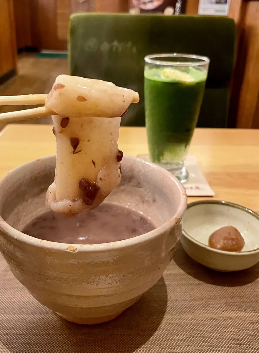 投稿を表示抹茶ソーダにとろ〜りお餅のぜんざい✨