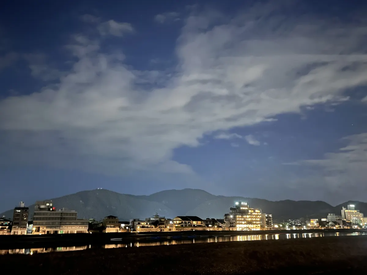 夜に来たのははじめてでした。川辺の街明かりと、なだらかな山並みと澄んだ空がきれいでした。