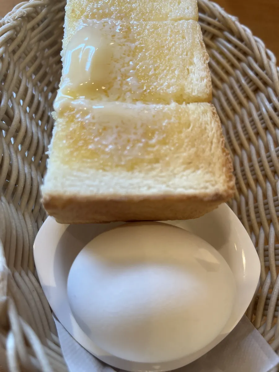 今日はゆでたまごを豆皿に入れてくださったので、バター多めのトーストをカゴの縁と豆皿で平行に保つことができて、カゴも紙ナプキンも汚さずにすみました😍
