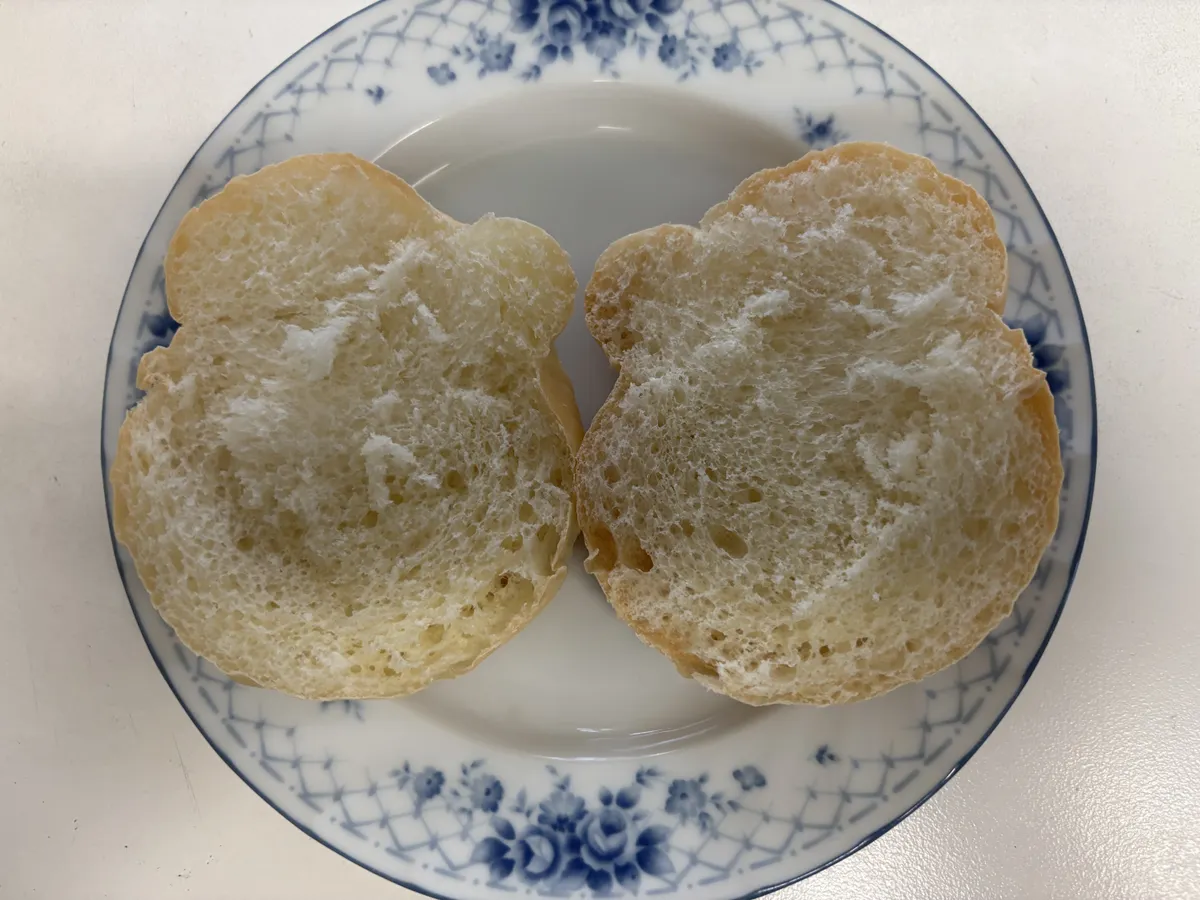 結びパンを半分に切ります。