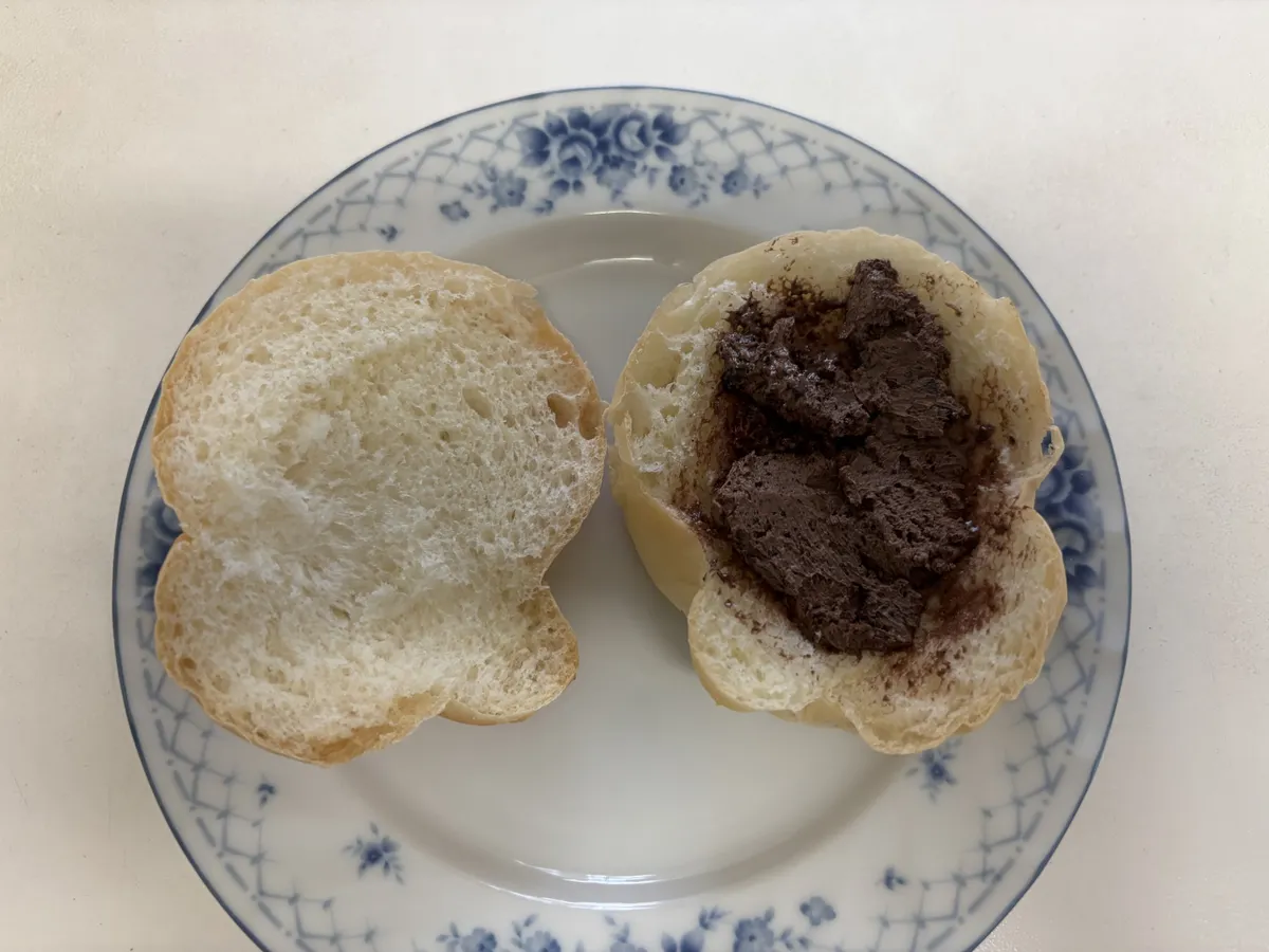 昨日いただいてきた結びパンを、先日行ってきた有楽製菓のワクザクファクトリーで買ったブラックサンダークリームを塗って食べました。