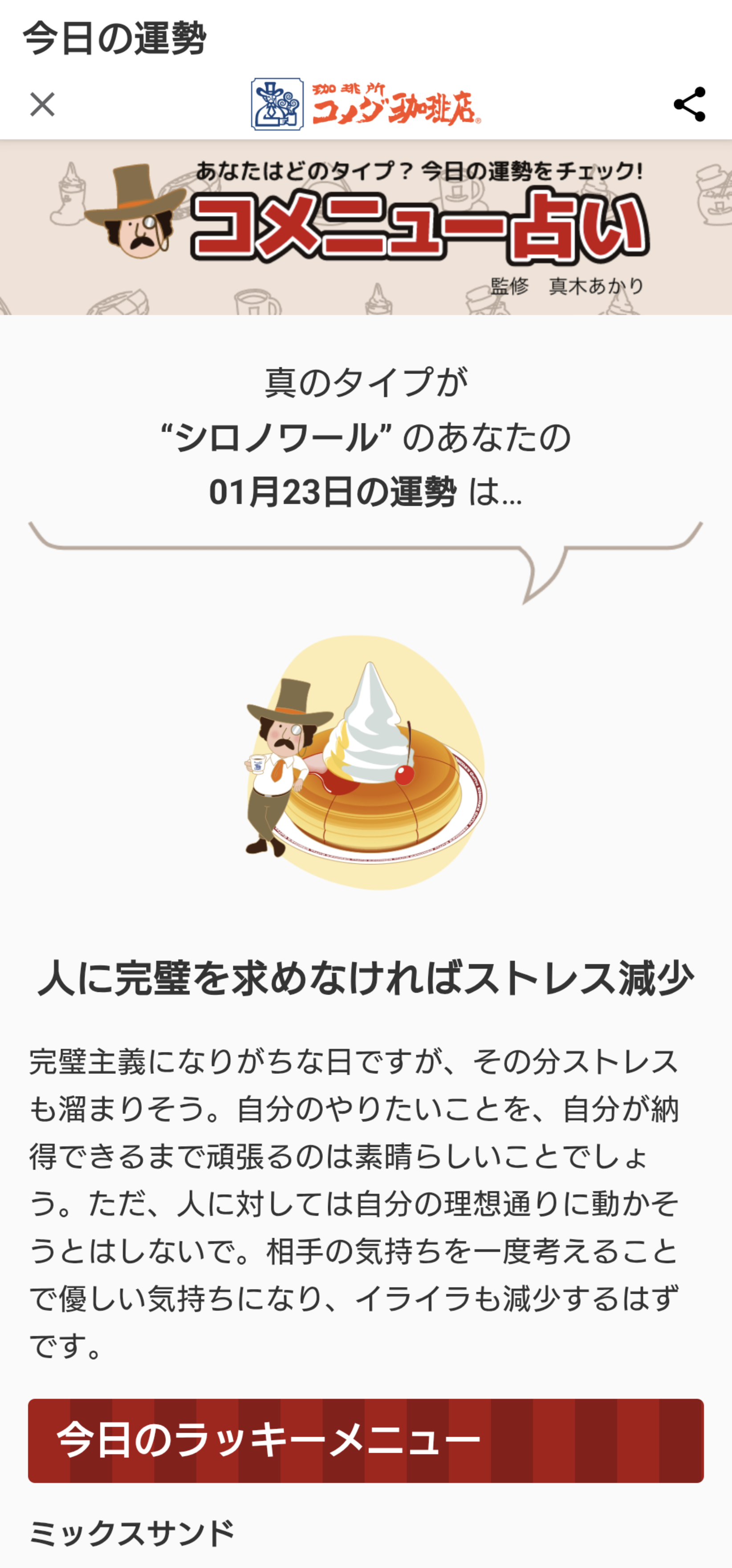 トップ > コメダ写真館 > ラッキーメニューの… す~にゃ 2026/01/23 21:15 ラッキーメニューの… ミックスサンドでございます🥪 毎度のボリューミー断面です🤗 モバイルオーダー特典ドリンク1杯無料チケット1枚目の有効期限が明日に迫ってたので今回メロンソーダに利用しました🎫 別々クリームソーダであります🤣 甘味補充完了👮 いいね 共有する 共有する X facebook LINE リンクをコピー コメントする 2 件の返信 (新着順) ミュートしたユーザーの投稿です。 投稿を表示 おなかすいた 2026/01/25 11:14 断面ありがとうございます💖(断面すき) ミックスサンドのたまごペースト層が厚い😍 プリンのホイップも たっぷり😍✨️ いいね 返信する ミュートしたユーザーの投稿です。 投稿を表示 コメディストA 2026/01/23 21:45 す〜にゃさん♪こんばんは🌟 ラッキーメニューのミックスサンド🥪が食べられて、よかったですね💓 メロンソーダも無料チケットで使えるんですね〜💦 知りませんでした😅 ありがとうございます💕💕💕 いいね 返信する ミュートしたユーザーの投稿です。 投稿を表示 す~にゃ 2026/01/24 06:42 コメディストA コメディストAさんコメントありがとうございます😺 無料券が使えるドリンクは以下です(コメダ公式HPより) ⬇️ コメダブレンド、アメリカン、カフェオーレ、ミルクコーヒー、アイスコーヒー、アイスオーレ、アイスミルクコーヒー、カフェインレスコーヒー、カフェインレスアイスコーヒー、ホットティーレモン、ホットティーミルク、ホットティーストレート、アイスティーレモン、アイスティーミルク、アイスティーストレート、ホットミルク、アイスミルク、メロンソーダ、コーラ、コーンスープ、とろみコーヒー ※たっぷりサイズは対象外です コメ黒やレモンスカッシュも使えないです😟 いいね 返信する ミュートしたユーザーの投稿です。 投稿を表示 コメディストA 2026/01/24 09:50 す~にゃ す〜にゃさん♪ おはようございます😃 詳しく教えてくださって、ありがとうございます🙇♀️ 意外と多いですね🥰 今度、メロンソーダ注文してみます🍈 いいね 返信する