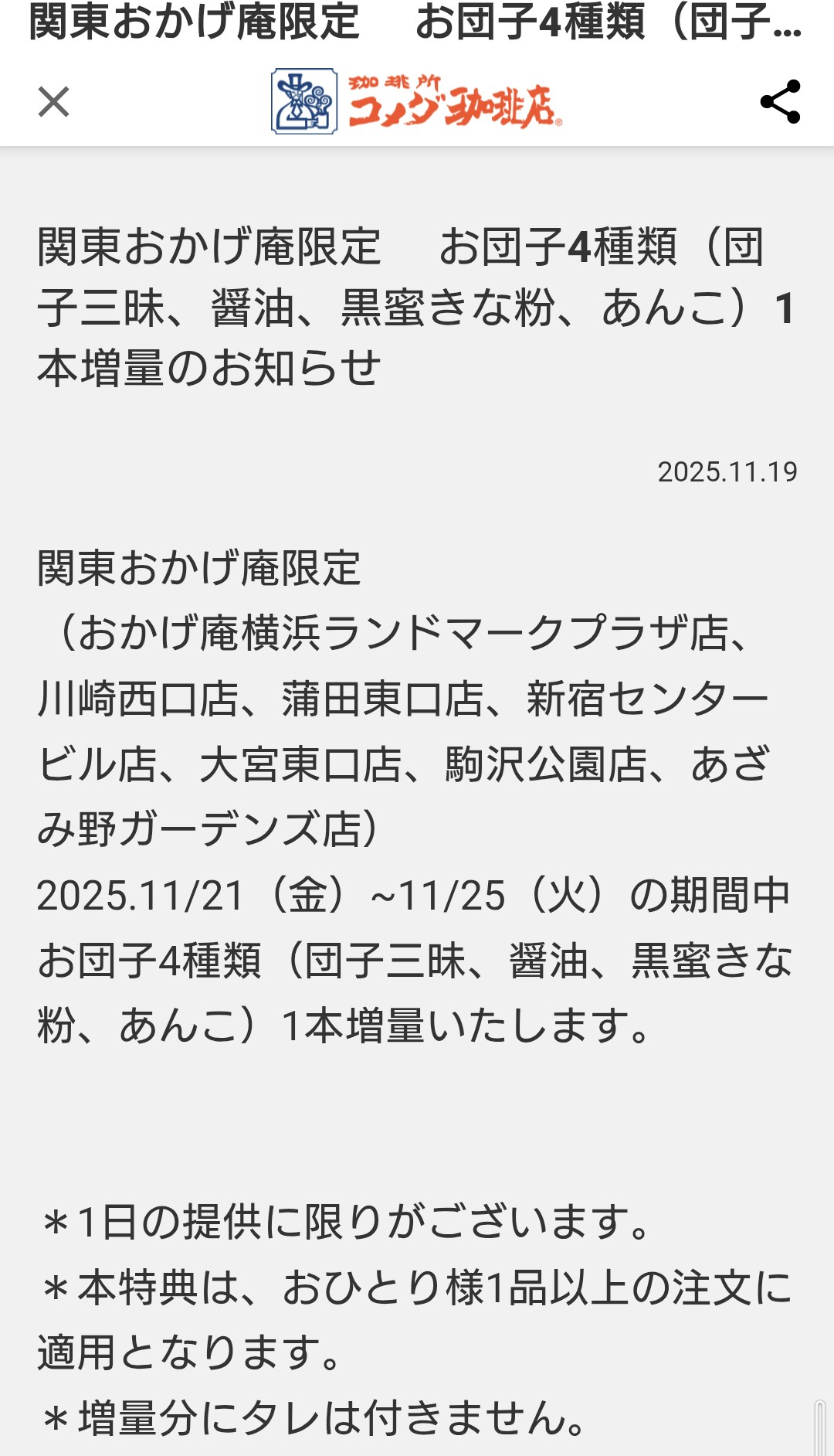 トップ > コメダ写真館 > 始まるよ〜🍡 みけお 2025/11/19 10:20 始まるよ〜🍡 限定ですが始まりますね。 楽しみです✨ コメダではグラクロも始まります‼️ 行かなくては😆 いいね 共有する 共有する X facebook LINE リンクをコピー コメントする 3 件の返信 (新着順) ミュートしたユーザーの投稿です。 投稿を表示 おなかすいた 2025/11/19 18:35 みけおさん、お得情報ありがとうございます😙💕 愛知県内(葵店・新開町店・茶屋ヶ坂店・長久手店・緑区滝の水店・上飯田店・栄広小路店・本店)の おかげ庵でも1本増量が21日からはじまりますー😋 早い時間帯が狙い目ですね💨 いいね 返信する ミュートしたユーザーの投稿です。 投稿を表示 みけお 2025/11/20 06:41 おなかすいた おなかすいたさん、おはようございます😃 コメントありがとうございます。 愛知県内でも始まるのですね‼️ 一本増量って嬉しいですね💖 私も早い時間帯狙って行きたいです😊 いいね 返信する ミュートしたユーザーの投稿です。 投稿を表示 dabo 2025/11/19 16:27 うわぁ~😆💕 お団子増量だなんて、こっちにおかげ庵があったら絶対に行く🍡 久しぶりにおかげ庵のメニュー食べたい😋 来週発売のグラクロは絶対食べるぞぉ~🐘💪 いいね 返信する 他 4 件の返信を表示 ミュートしたユーザーの投稿です。 投稿を表示 みけお 2025/11/20 06:37 dabo daboさん、おはようございます😊 コメントありがとうございます。 おかげ庵がもっともっと全国に展開すれば良いと思います。 横浜まで電車で行ったりしていました。 グラクロ、私も絶対食べなくては😁 美味しくて、この時期の楽しみです。 どちらを先に食べようか、今から悩んでいます😆 いいね 返信する ミュートしたユーザーの投稿です。 投稿を表示 toratora 2025/11/20 10:05 dabo グラコロ来週からなんですね! グラコロの季節が一番好きです! マックのも食べたいけどコメダのも食べたい! いいね 返信する ミュートしたユーザーの投稿です。 投稿を表示 dabo 2025/11/20 10:35 みけお おかげ庵の様子を見る度に、行ける方々が羨ましいです😍 最寄りは愛知だし🚗で行ける距離じゃない…😱 グラクロ🍔私は新しい味から食べようと思ってます☺️(限定物に弱い💦) いいね 返信する ミュートしたユーザーの投稿です。 投稿を表示 dabo 2025/11/20 10:41 toratora グラクロ、26日からですね🍔 マックのグラコロも捨てがたい😂 食べ比べじゃ〜😋 いいね 返信する ミュートしたユーザーの投稿です。 投稿を表示 みけお 2025/11/20 14:31 toratora torataroさん、こんにちは✨️ コメントありがとうございます。 マックのグラコロも食べてみたい。 もちろんコメダのグラクロも食べますよ💖 グラクロ大好きです😊 いいね 返信する ミュートしたユーザーの投稿です。 投稿を表示 みけお 2025/11/20 14:35 dabo daboさん、こんにちは😃 わかります。おかげ庵へ電車に揺られて2時間かかって行っていました😁 限定ものって、特に魅力的ですよね❣️ 私もグラクロ大好きです😊 いいね 返信する ミュートしたユーザーの投稿です。 投稿を表示 のりべ 2025/11/19 10:44 みけお お団子、3つが4つは凄いお得😉❗ 夫が楽しみにしていたグラコロももうすぐ始まりますね😊❇️❇️ 夜コメ楽しみです🎶 いいね 返信する ミュートしたユーザーの投稿です。 投稿を表示 みけお 2025/11/19 14:22 のりべ のりべさん、こんにちは✨️ コメントありがとうございます🐾 お団子が一本増えるって、なかなかないですね❣️ グラクロ、美味しいですよね‼️ 楽しみが増えるって幸せです💖 いいね 返信する