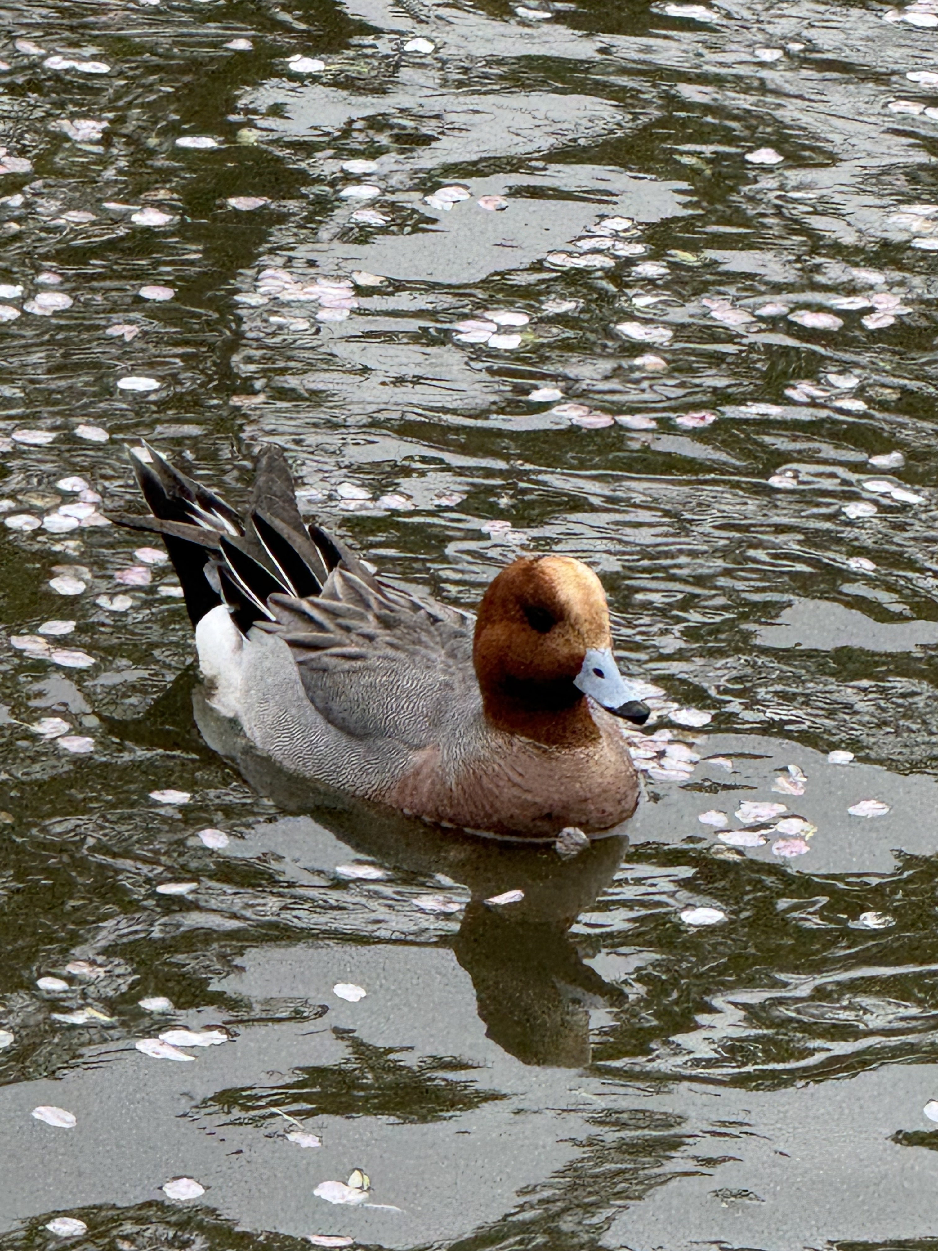 ヒドリガモさんも桜の花びらの中を泳いで、気持ちよさそうです🦆