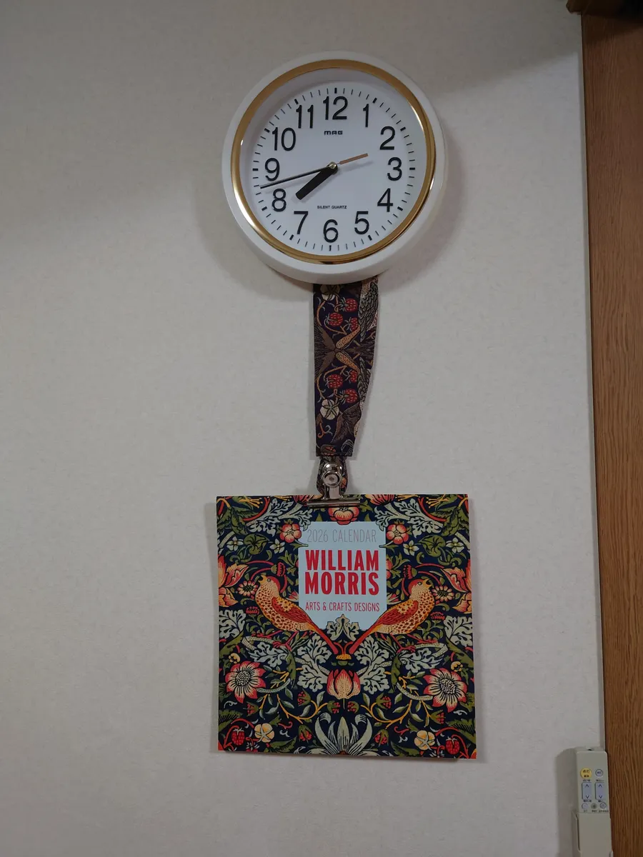 時計が掛けてあるネジを利用して、同じ柄のカレンダーです。