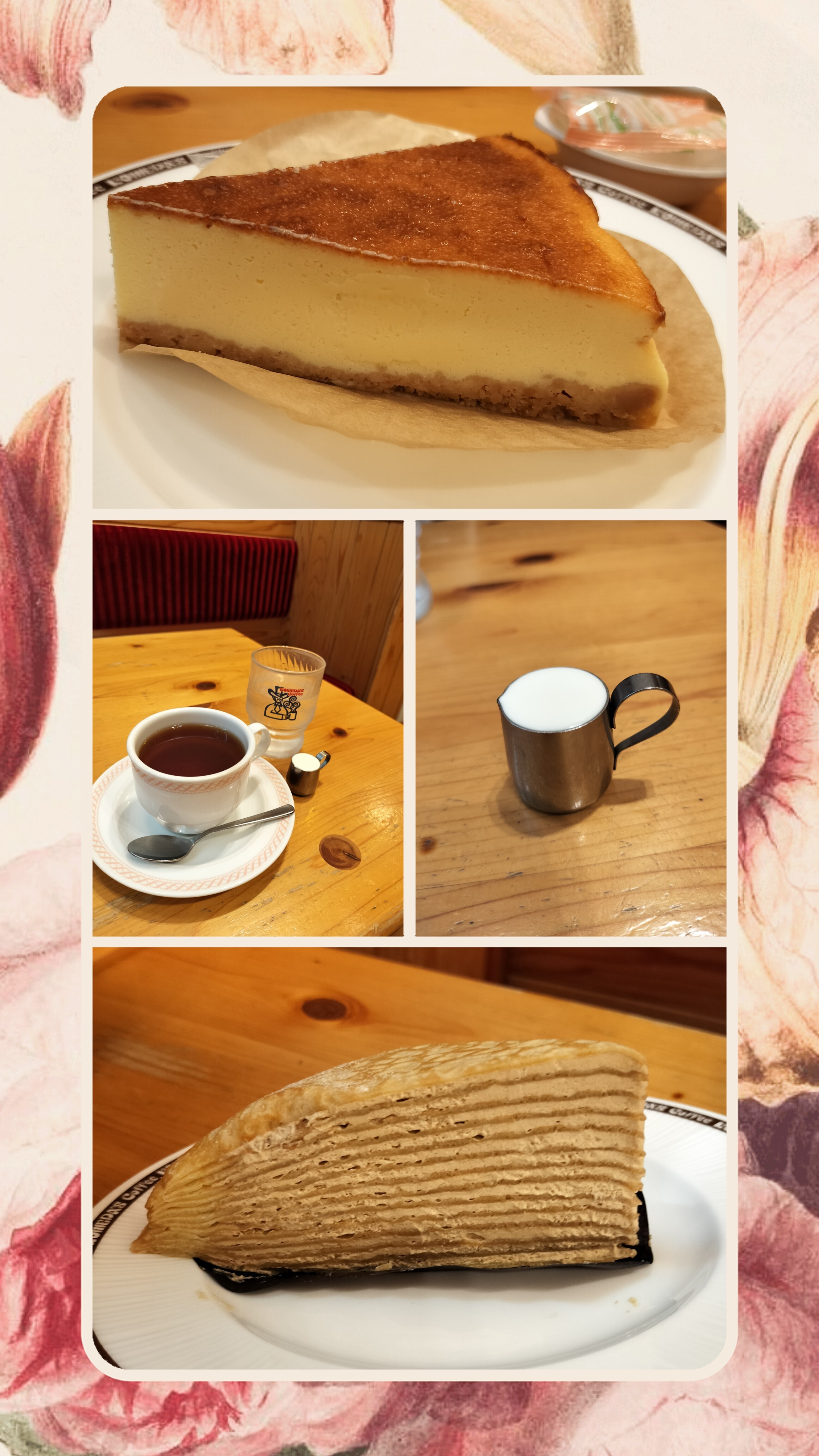 私ベイクドチーズケーキ🧀&ミルクティー🫖 次女はキャラメルサレ&ミルクコーヒー☕🐄 ピッチャーから溢れんばかりのミルク🫨