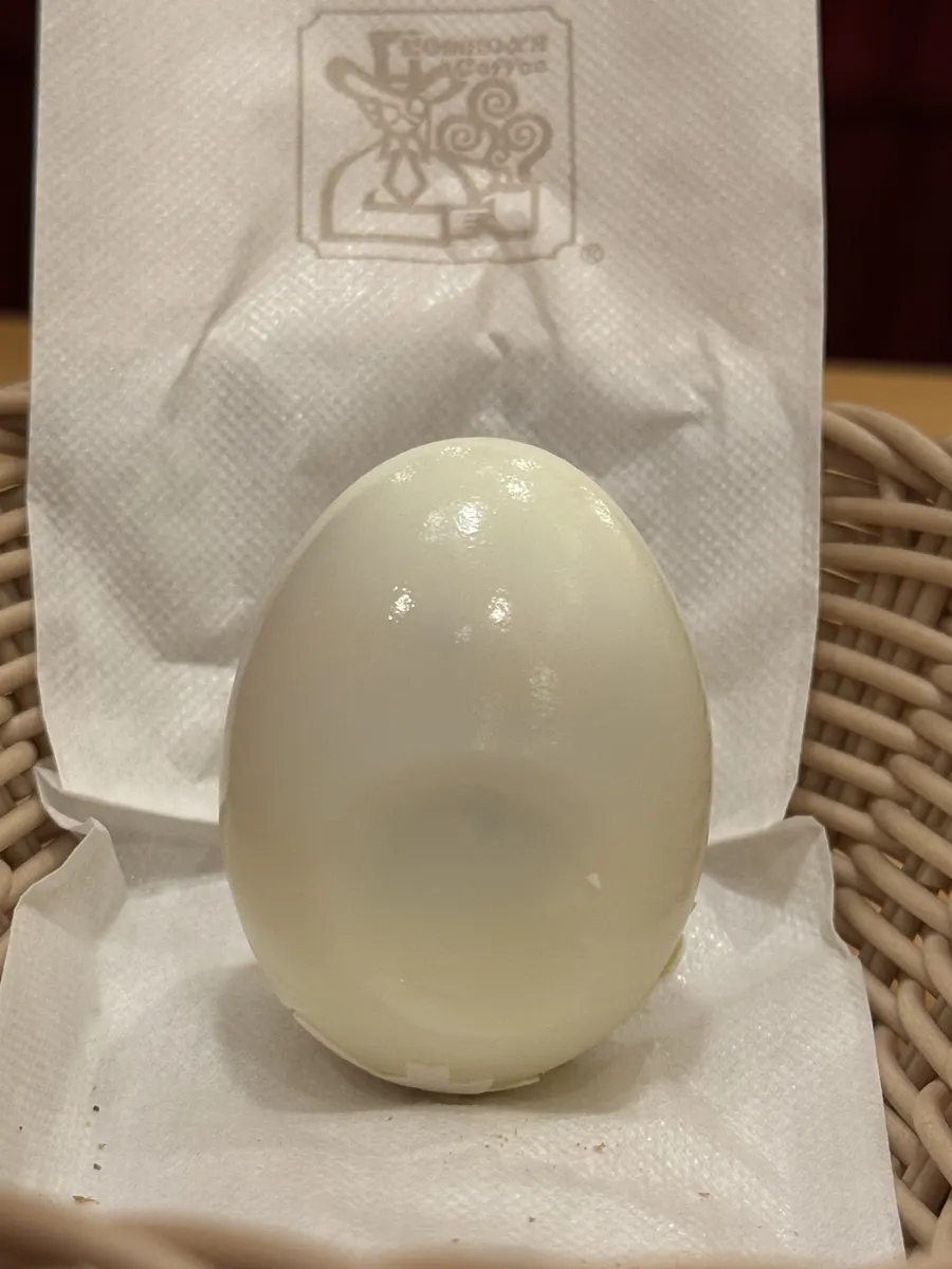 ゆでたまご🥚さんは、最近パン籠の中が定位置になってしまったけど、茹で加減が最高なので、モーニングには不可欠な存在ですね😋。