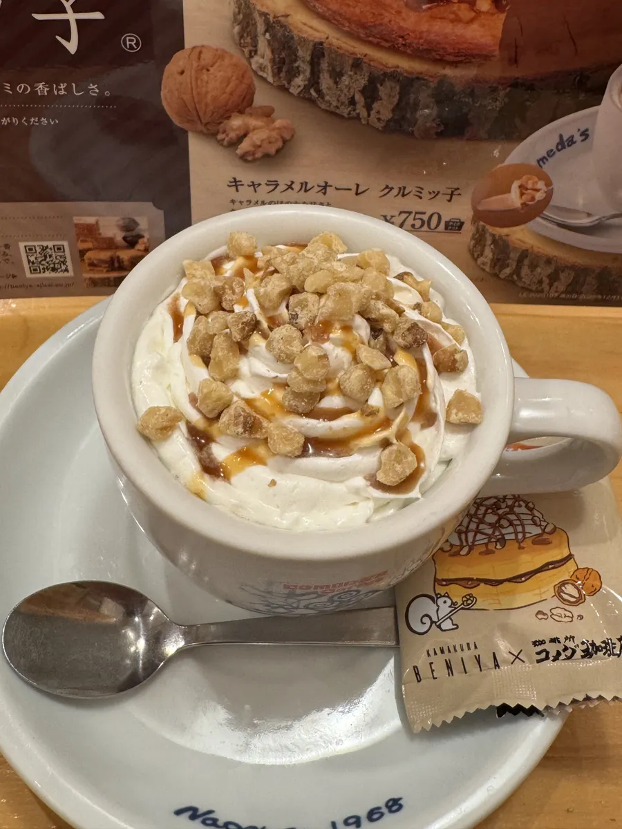 キャラメルオーレにホイップとキャラメルソースと香ばしいクルミが溶け合って、芳醇な飲むクルミッ子になっていきます🐿️✨