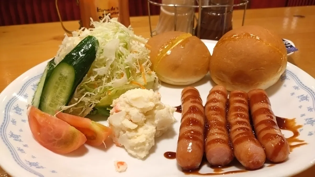 バターたっぷりローブパンに挟まれたソーセージ、ドレッシングがWがけされた野菜サラダ…堪らないですね🤤
