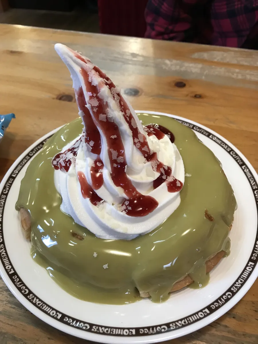 私は、ホットドッグとお馴染み〜シロノワール ピスタチオ・ルージュとオリジナルブレンドホット❗️