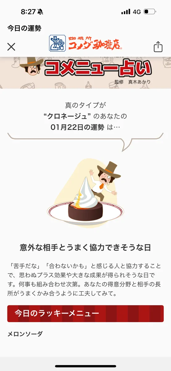 トップ > コメダ写真館 > 1月22日のラッキーメニュー🎶 うさごん 2026/01/22 19:14 1月22日のラッキーメニュー🎶 今朝は氷点下の冷え込みの木曜日。 『今日のラッキーメニュー』は… メロンソーダです💚✨。 今日はモーニングではなく、おやつタイムにいただきました😋。 炭酸には揚げ物系のポテチキ😁。 コメチキ3個とホクホクポテト両方食べられてとっても幸せです☺️🎶 締めの豆菓子は9粒でした🫘。 今日は仕事がお休みなので、早朝の公園をお散歩していたら、カワセミも遊びに来ていました💚。 あっという間に飛び去ってしまいましたが、今日もラッキーメニューでハッピーな1日の始まりでした🥰💕。 いいね 共有する 共有する X facebook LINE リンクをコピー コメントする 8 件の返信 (新着順) ミュートしたユーザーの投稿です。 投稿を表示 コメディストA 2026/01/23 13:03 うさごんさん♪こんにちは🌞 『今日のラッキーメニューを楽しもう٩( 'ω' )و❣️』 22日目達成❗️おめでとうございます🎉🎉🎉 今日はメロンソーダ🍈 ブーツグラスに入ったメロンソーダ💚🍈 鮮やかでキラキラと宝石みたいに美しい色ですね💘 ポテチキ🤎との最高の組み合わせを堪能されて、とても美味しそうです💓 どうしてもクリームソーダを注文しがちなので、メロンソーダ単体の注文は自分ではしないですよね🥰 ラッキーメニューのご利益なのか、カワセミさんまでお祝いに駆けつけてくれて、素晴らしいですね💓 毎日寒いですが、素敵な週末をお過ごしくださいませ💕💕💕 いいね 返信する ミュートしたユーザーの投稿です。 投稿を表示 うさごん 2026/01/23 21:28 コメディストA コメディストAさん、こんばんは😃。 ありがとうございます😊✨。 毎日楽しんでいたらあっという間に『今日のラッキーメニュー』も後半になって来ました〜😆🎶 そしてメロンソーダはコメダ珈琲店では初めてのオーダーでした💚✨。 私もクリームソーダはよく飲んでいるのに、メロンソーダは不思議と飲む機会が無かったです🫢。 最初飲み物だけにしようと思って、でもやっぱり何か一緒に食べたくて、1番相性が良さそうな物は何だろう🤔???って悩んで、しゅわしゅわにはフライ系🙋♀️🎶…で、フライドポテトとコメチキのいいとこ取りのポテチキになりました〜❤️。 早朝に出会ったカワセミさん、羽の色がメロンソーダを予感させる様なエメラルドグリーンで、メロンソーダを見たら朝のカワセミさんを思い出しました💚✨。 コメントありがとうございます🌸。 明日も寒そうですが、素敵💓な一日をお過ごしください🥰💕。 いいね 返信する ミュートしたユーザーの投稿です。 投稿を表示 コーン 2026/01/22 22:38 うさごんさん、こんばんは! カワセミさんに出会われたんですか😳 躍動感あるお写真ですね🌟 ブーツグラスのメロンソーダ🥂キラッキラで美しいですね! シュワシュワと揚げ物、合いますね💖 いいね 返信する 他 1 件の返信を表示 ミュートしたユーザーの投稿です。 投稿を表示 うさごん 2026/01/23 21:07 コーン コーンさん、こんばんは😃。 休日の凍てつくような寒い朝だったので、何と無く早朝のお散歩をしながら公園の池に飛来した水鳥さんを眺めていたらその子の向こう側にとっても綺麗な色の鳥が飛んできて、それがカワセミさんでした😍💗💗💗✨。 少しだけ羽を休めたらすぐに飛び去ってしまって、それが2枚目の写真です😅💦 『今日のラッキーメニュー』のメロンソーダを予言するかのようなカワセミさんの鮮やかなエメラルドグリーンに運命の扉を叩く音がした様な気がしました(笑)💚。 コメダ珈琲店でのメロンソーダは初めてで、ブーツグラスに入ってくるとそれだけで美味しさもアップ⤴️⤴️⤴️ですね😍❣️❣️❣️ ポテチキとの相性も抜群で、遅めのランチとおやつを足して2で割った様なほっこりくつろぎタイムでした😁。 コメントありがとうございます🌸。 お仕事お疲れ様でした❣️ 明日も素敵💓な一日をお過ごしください🥰💕。 最初に見ていたのはユリカモメさんでした🎶 いいね 返信する ミュートしたユーザーの投稿です。 投稿を表示 コーン 2026/01/23 22:21 うさごん ユリカモメさん😳🌟 美しいですね〜💕 ここ最近特に寒いですが、うさごんさんの美しいお写真🕊️を見ていると、冬も良いなぁと思います☺️ お写真ありがとうございます! 一日お疲れさまでした🌟 いいね 返信する ミュートしたユーザーの投稿です。 投稿を表示 うさごん 2026/01/25 09:26 コーン コーンさん、おはようございます😃 真夏大好き❤の私なので、寒い冬は超苦手🥶💦 でも、真冬の早朝は霜柱や池の氷が見られたり、水鳥さん達はとっても元気なので、早朝散歩オススメですよ〜❣️ ただいつもは家事が忙しいので、サボった時だけのお楽しみで〜す🤭。 いいね 返信する ミュートしたユーザーの投稿です。 投稿を表示 gon 2026/01/22 21:46 うさごんさん、こんばんは🌙 ラッキーメニューのメロンソーダ、