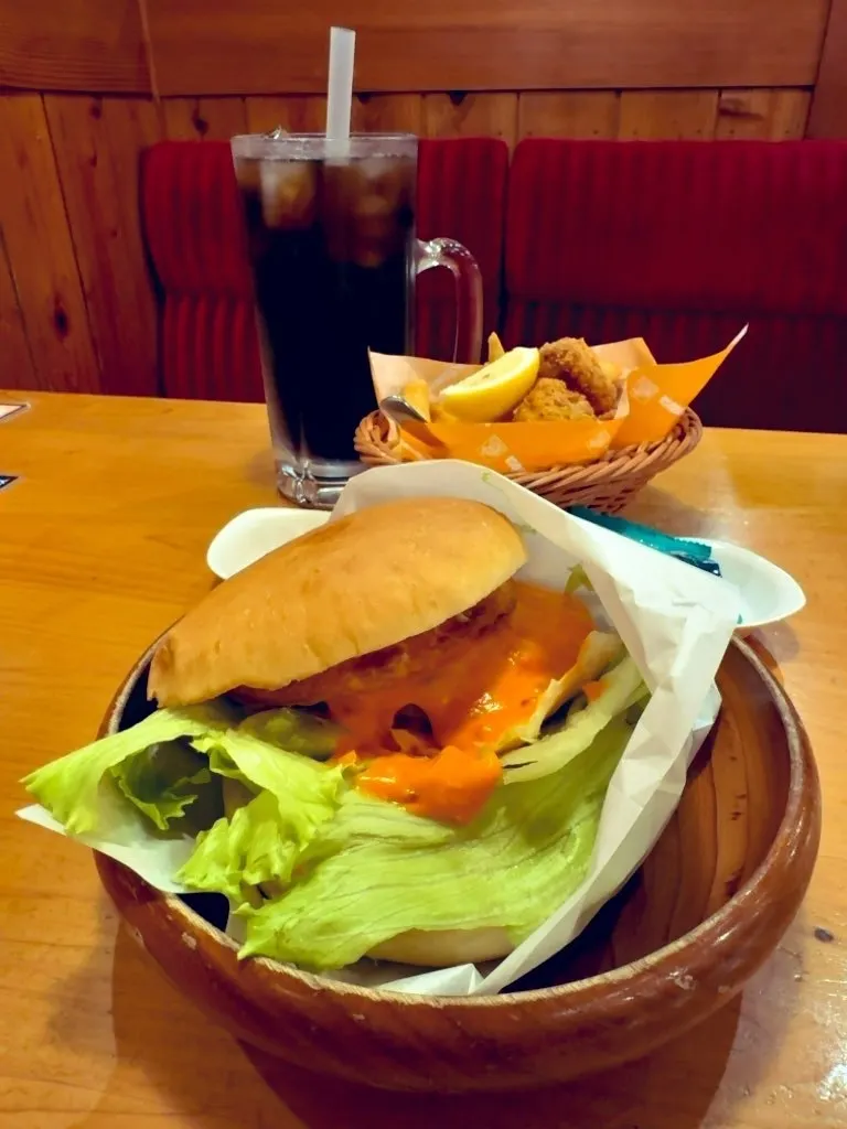 奥には遠近法でポテチキとでらたっぷりアイスコーヒー。