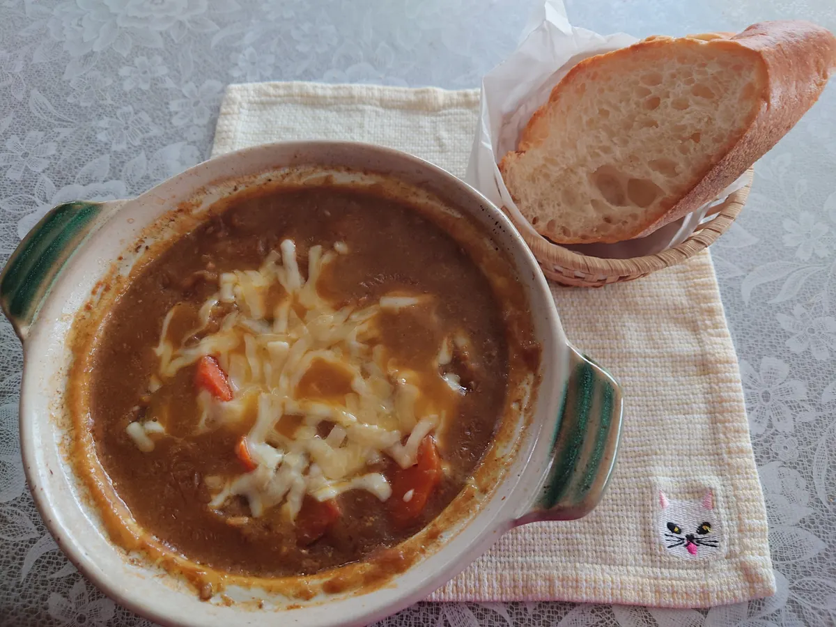 野菜はカレー用の冷凍野菜。肉は、先程買って来た挽肉。舞茸が冷蔵庫に有り、スーパーでサラダ豆を見つけ、それも入れました。そして、炒め玉葱が売っていたので購入。家に有ったスパイスや、ヨーグルトやコンソメ顆粒なんかも入れ、グツグツ煮て最後にチーズを乗せてまた、煮込み「溶けていないなぁ」と、電子レンジに30秒
