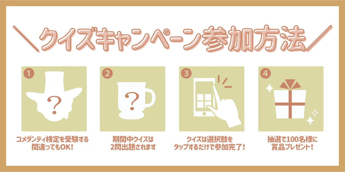 ③コメダンディ検定に全て参加した方且つ、今回のコメダンディクイズを1問でも回答した方の中から、抽選で100名様に賞品が当たるキャンペーンです。