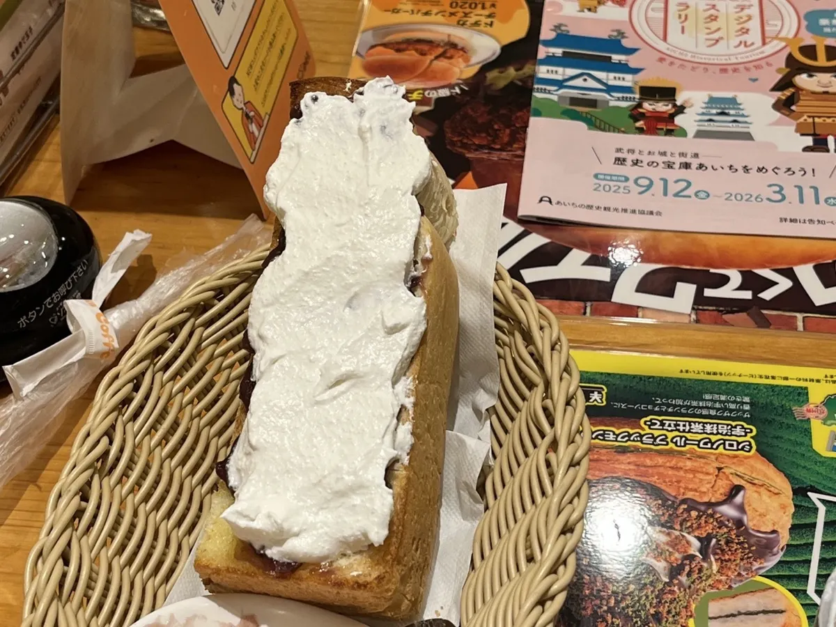 モーニングは、小倉トーストの上に、パフェスプーンですくったホイップを、アイスクリームスプーンの背を使って塗りました。