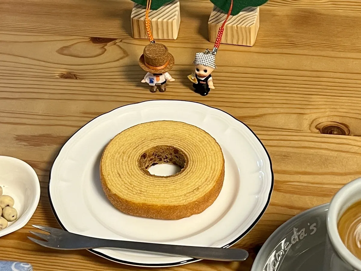 ところで、このバウム(Baum:ドイツ語で「木」)は、年輪になぞらえられる生地が何層かを数えたひとがいるかはわかりませんが、キューピーに対する大きさでいうと、樹齢400年くらいでしょうか。