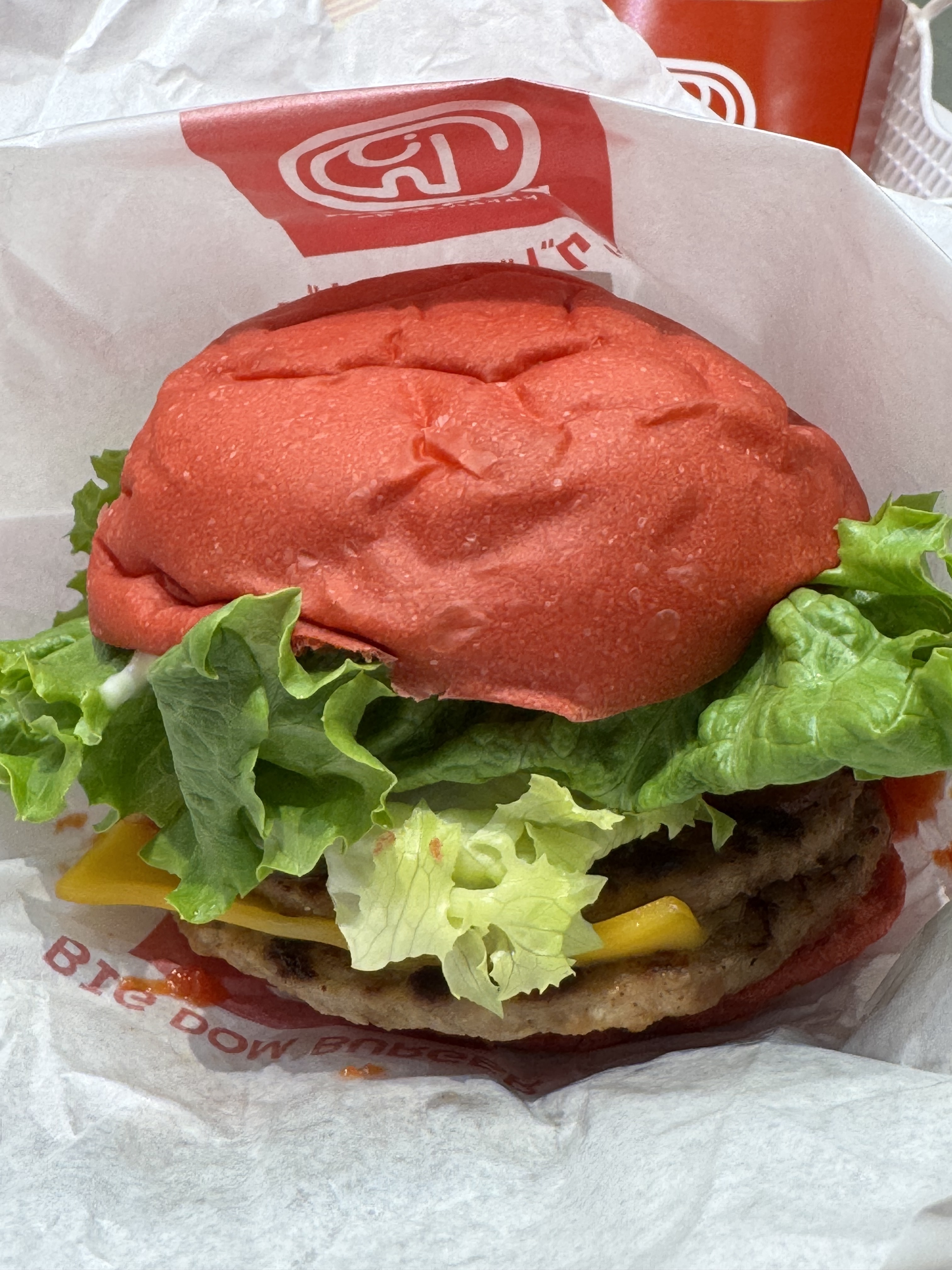 そしてレッドバンズのビッグドムトマトチーズ🍔赤いバンズに大きなシャキシャキレタス🥬と大きなチーズ🧀が挟まれていて、とっても美味しそうです💦