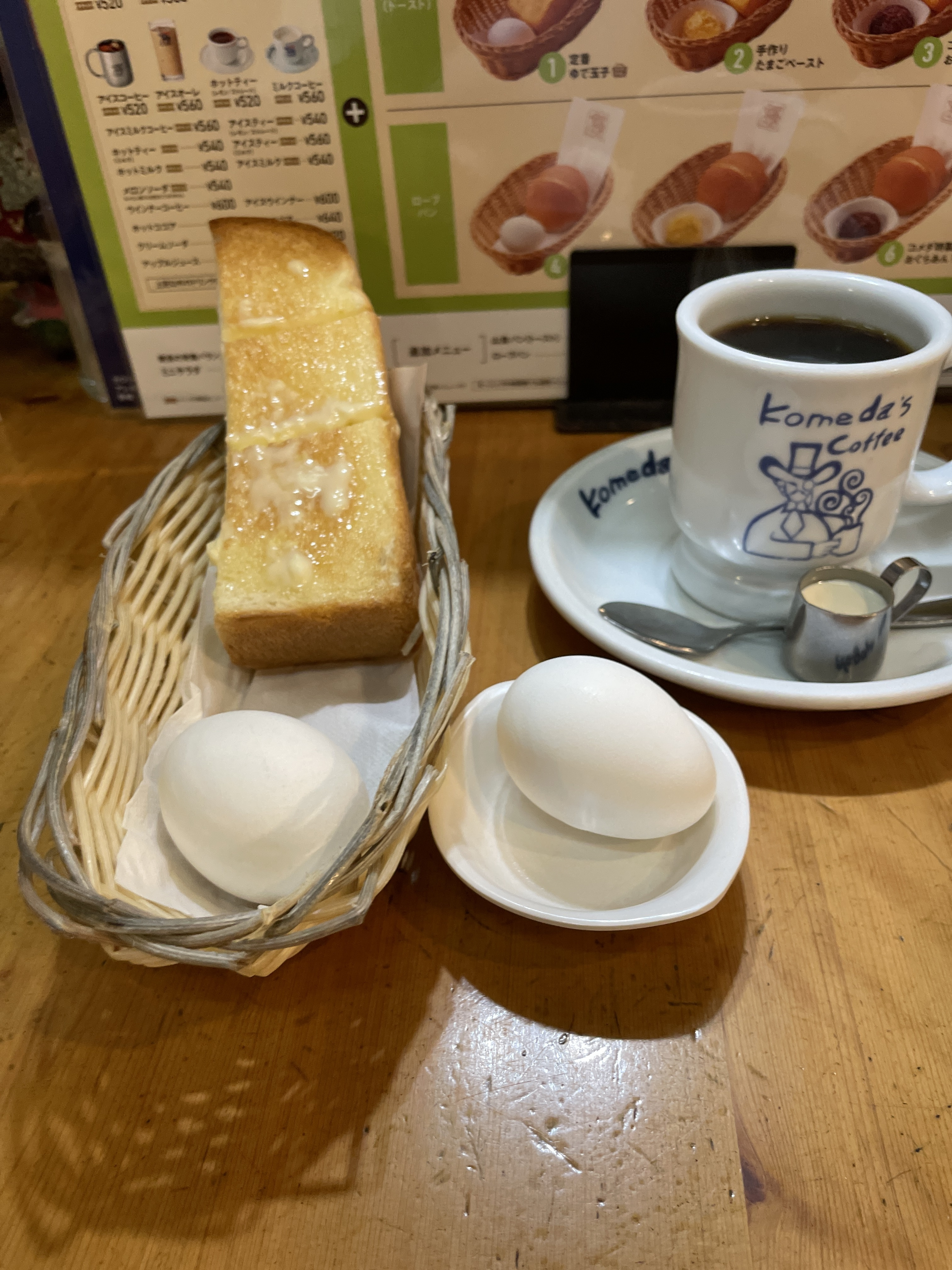 こんがりトーストにゆでたまこ2つ、素敵なパンカゴ。いい感じです。
