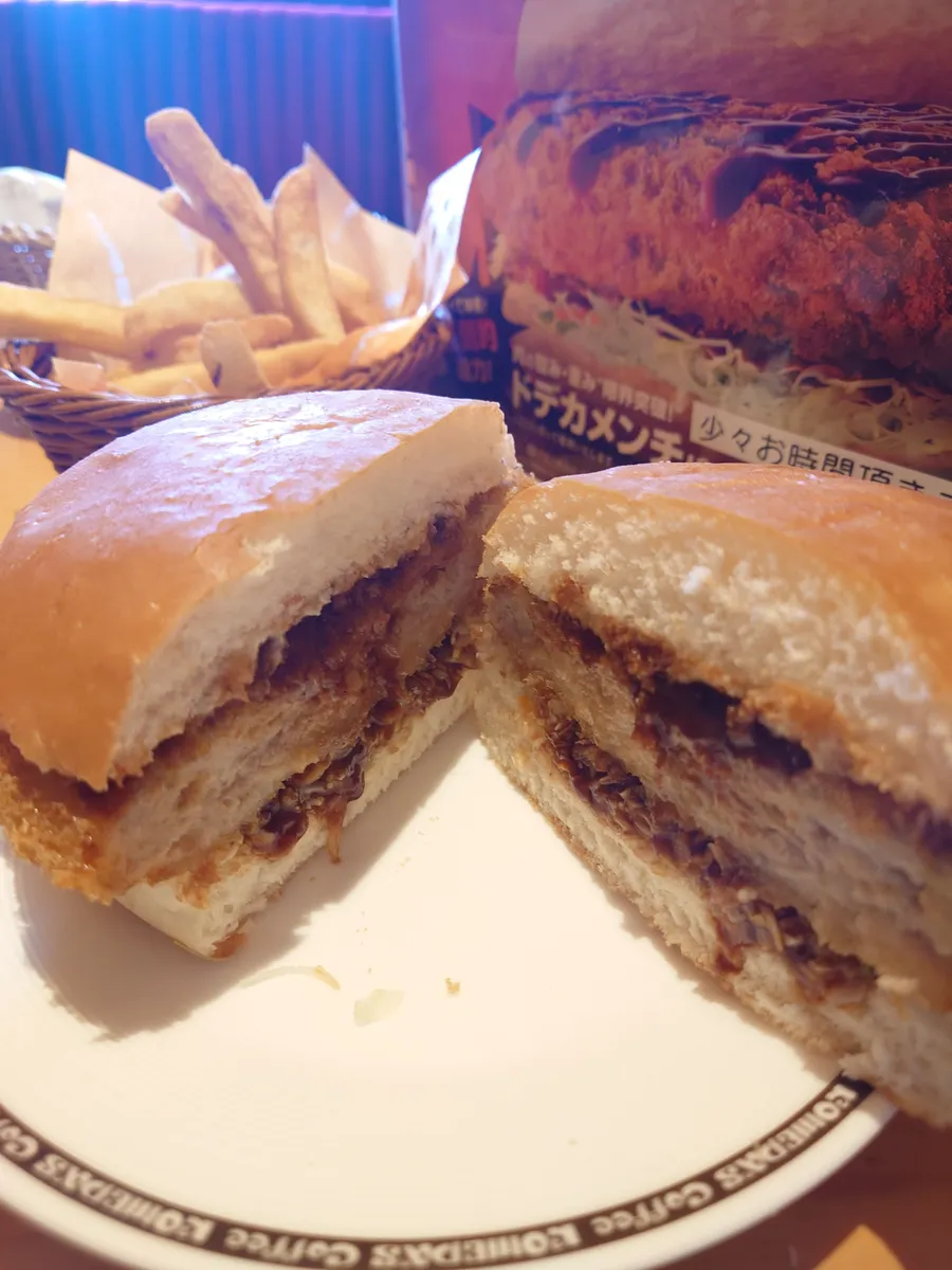 逆見本詐欺でお馴染みのコメダ珈琲さんが自らドデカと謳ったとネットでも話題のドデカメンチカツバーガーを頂きに😀