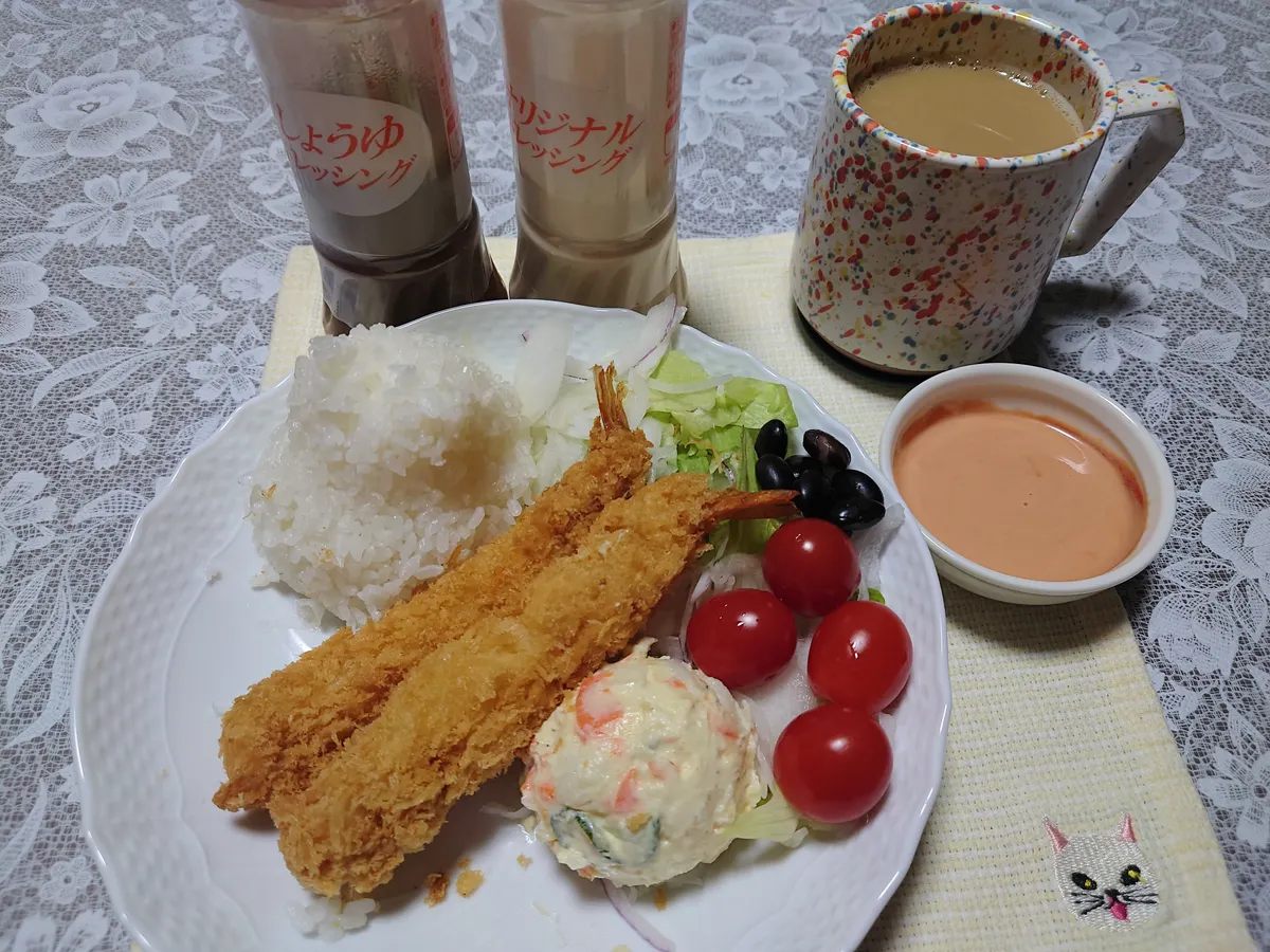 で、朝購入した海老フライを夕飯に頂く事にして、ポテトサラダがコメダの様に丸く盛り付けられたので、パチリ📸