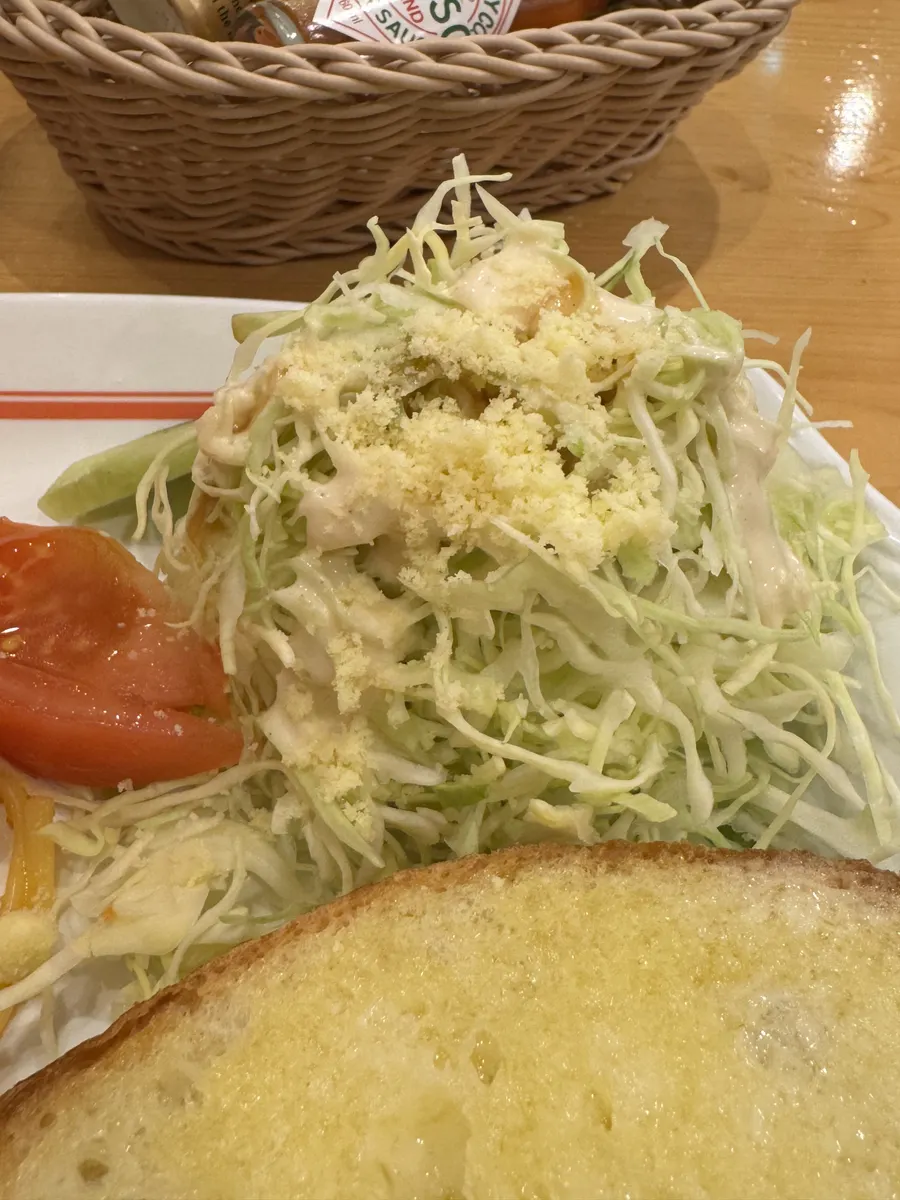 スパゲッティの時にはサラダ🥗にも粉チーズがかけられてとても嬉しいです😊🎶