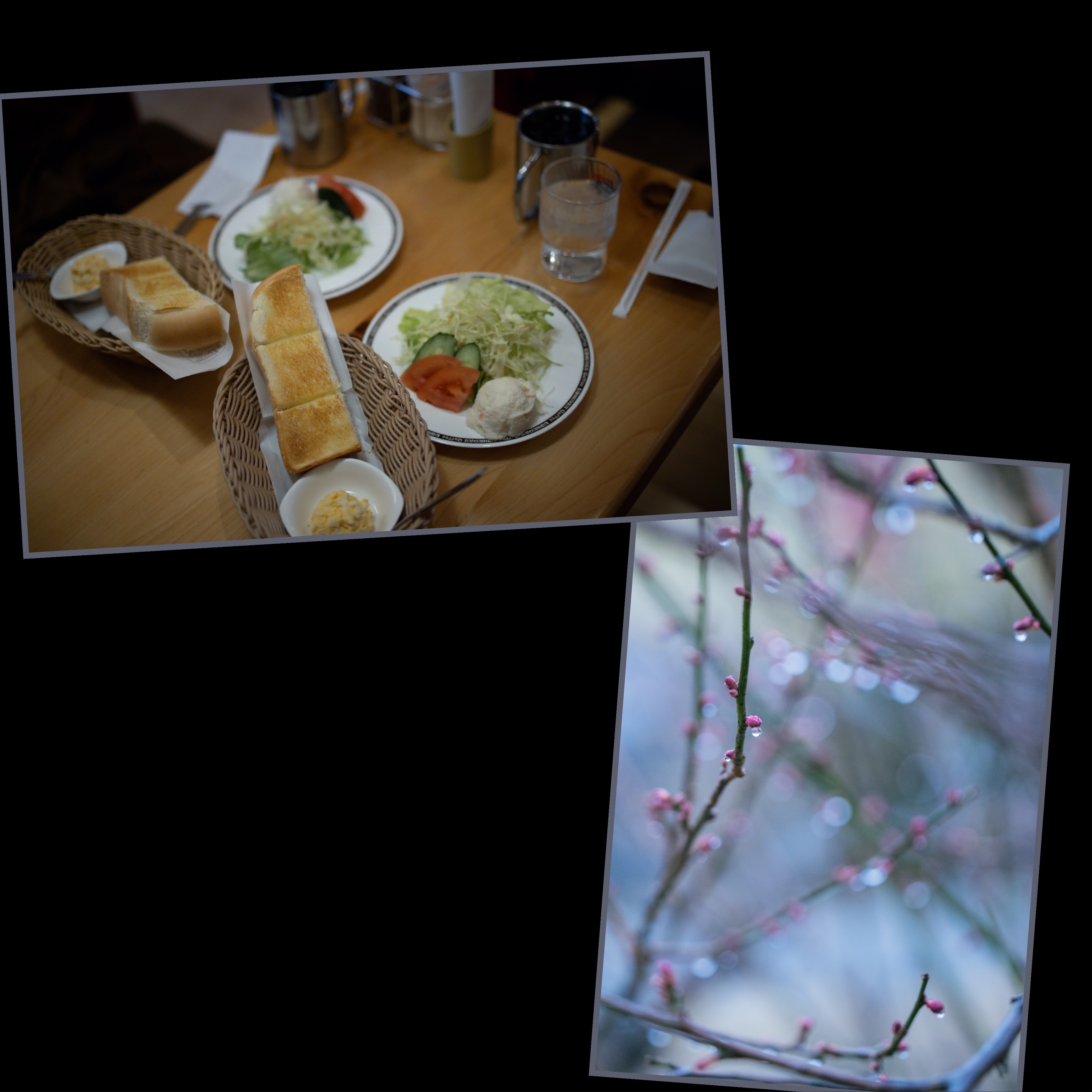 モーニングとミニサラダ🥗、そしてコーヒーもアイスが美味しい季節になって来たなぁ〜🎶…って撮影された時は寒空から降って来る雨で、もしかしたらまだ冷たい雨だったのかも知れませんが、梅のお花と一緒に拝見すると春の到来を感じる暖かな春雨に感じました🌸✨。