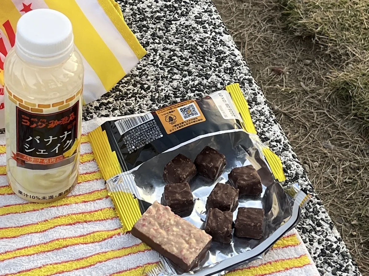 公園の池の島にベンチを見つけ、コンビニで買ったおやつにしました。きっぷとセットの割引券が使えました。それも、楽しみの一つでした。