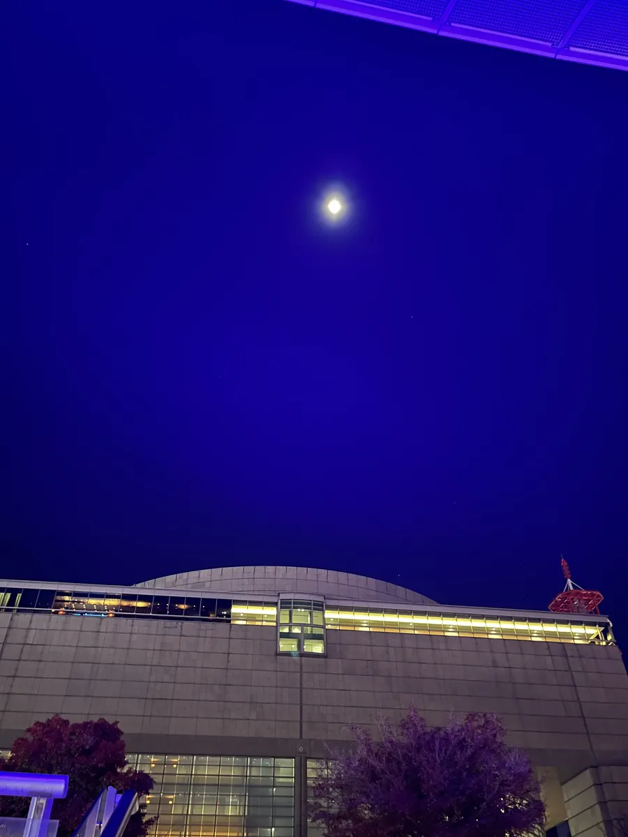 バスまでに時間があったので、緑の大地へ出ると、やがて水の宇宙船に差しかかろうとする月がきれいでした。