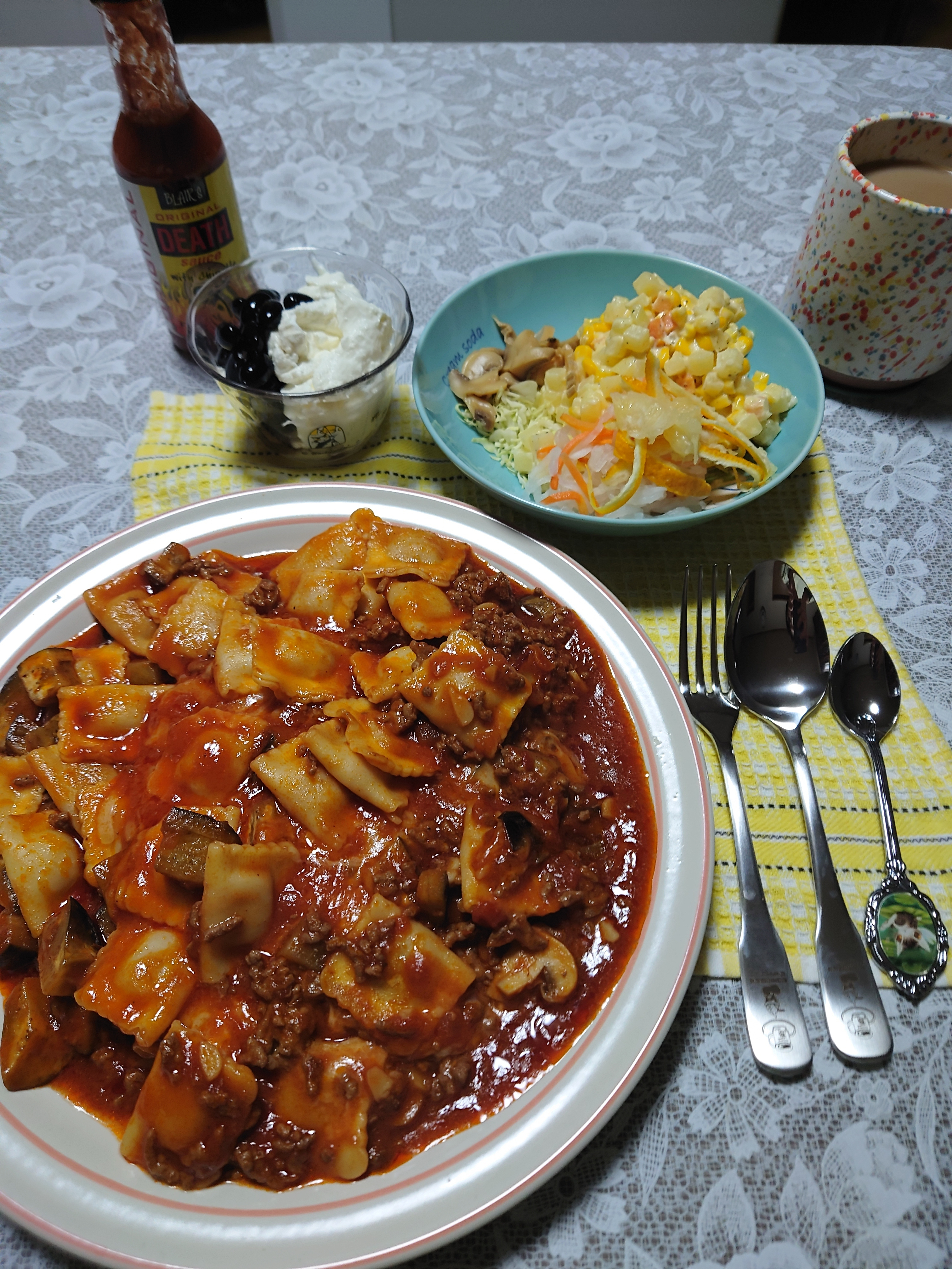今日の夕食は、ラビオリとサラダとヨーグルト。
