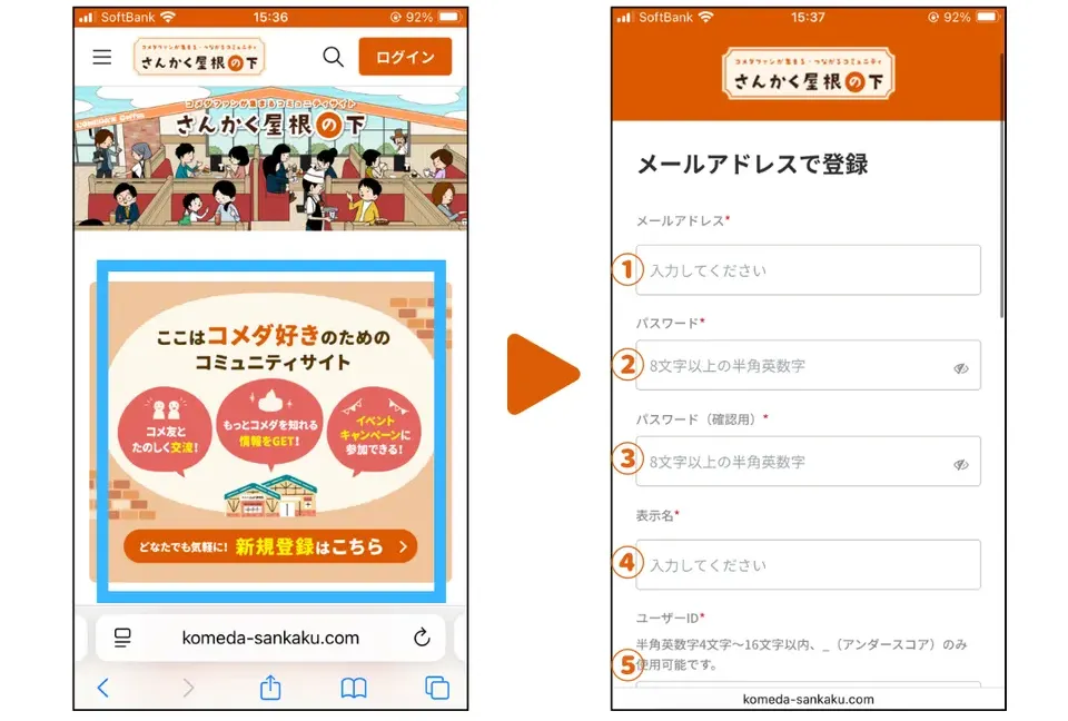 ※パソコンの場合は、右上にあるオレンジ色の「新規登録」ボタンから登録できます