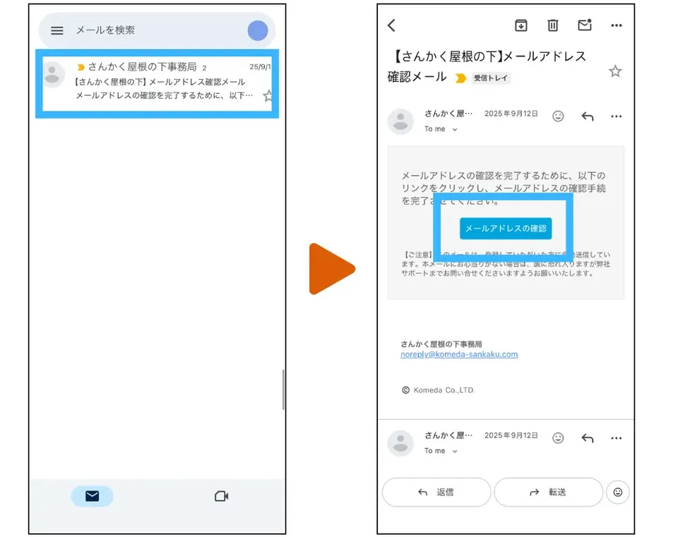 5. メールボックスをチェックし、「さんかく屋根の下事務局」から届いているメールを開く。