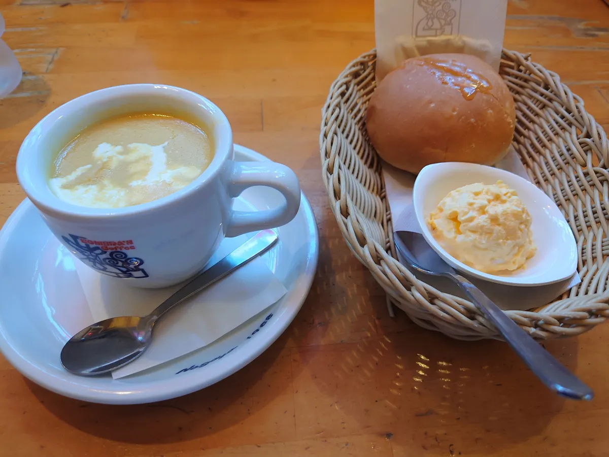 🌽コーンスープでモーニング🟡🥯美味しそうだぎゃー🤤✨