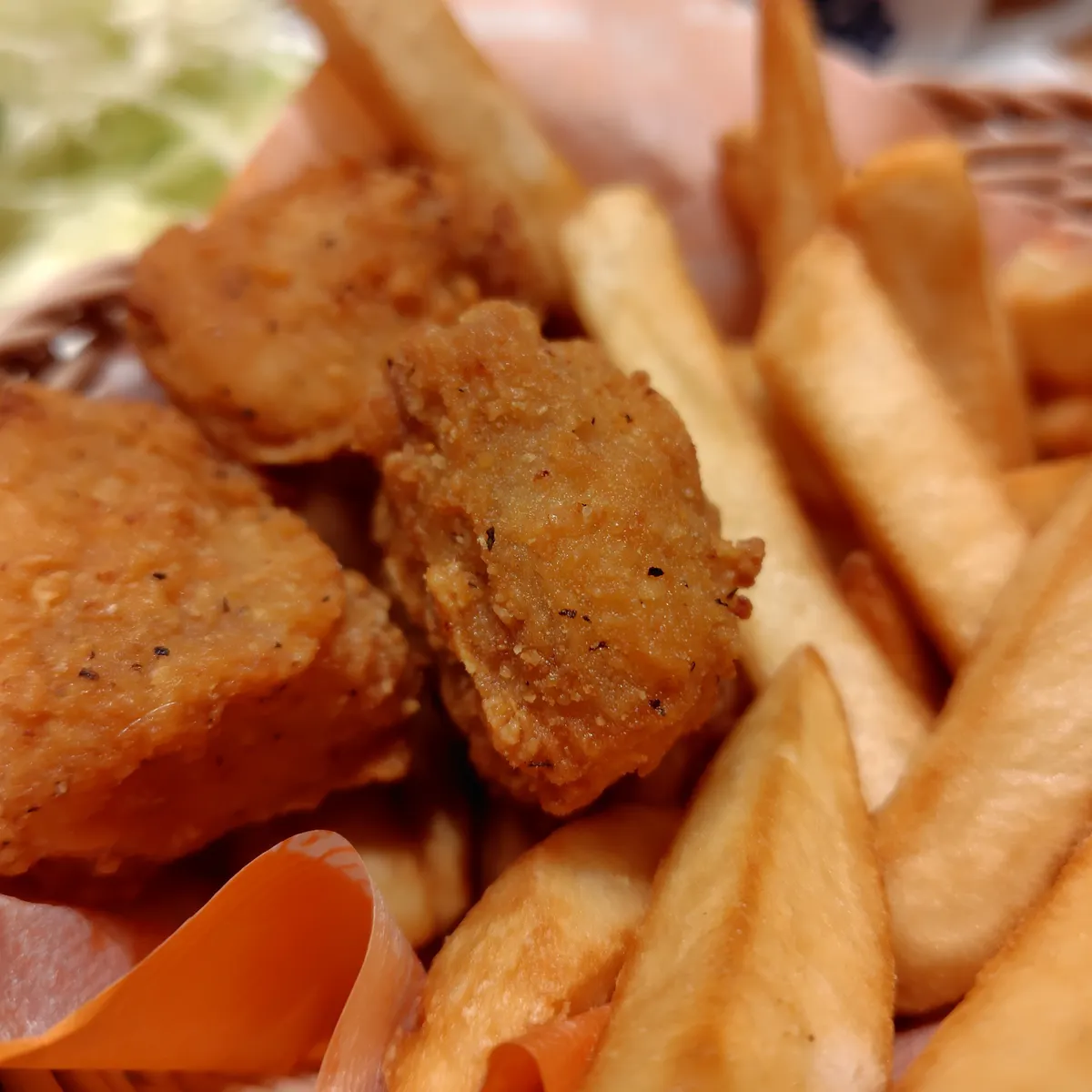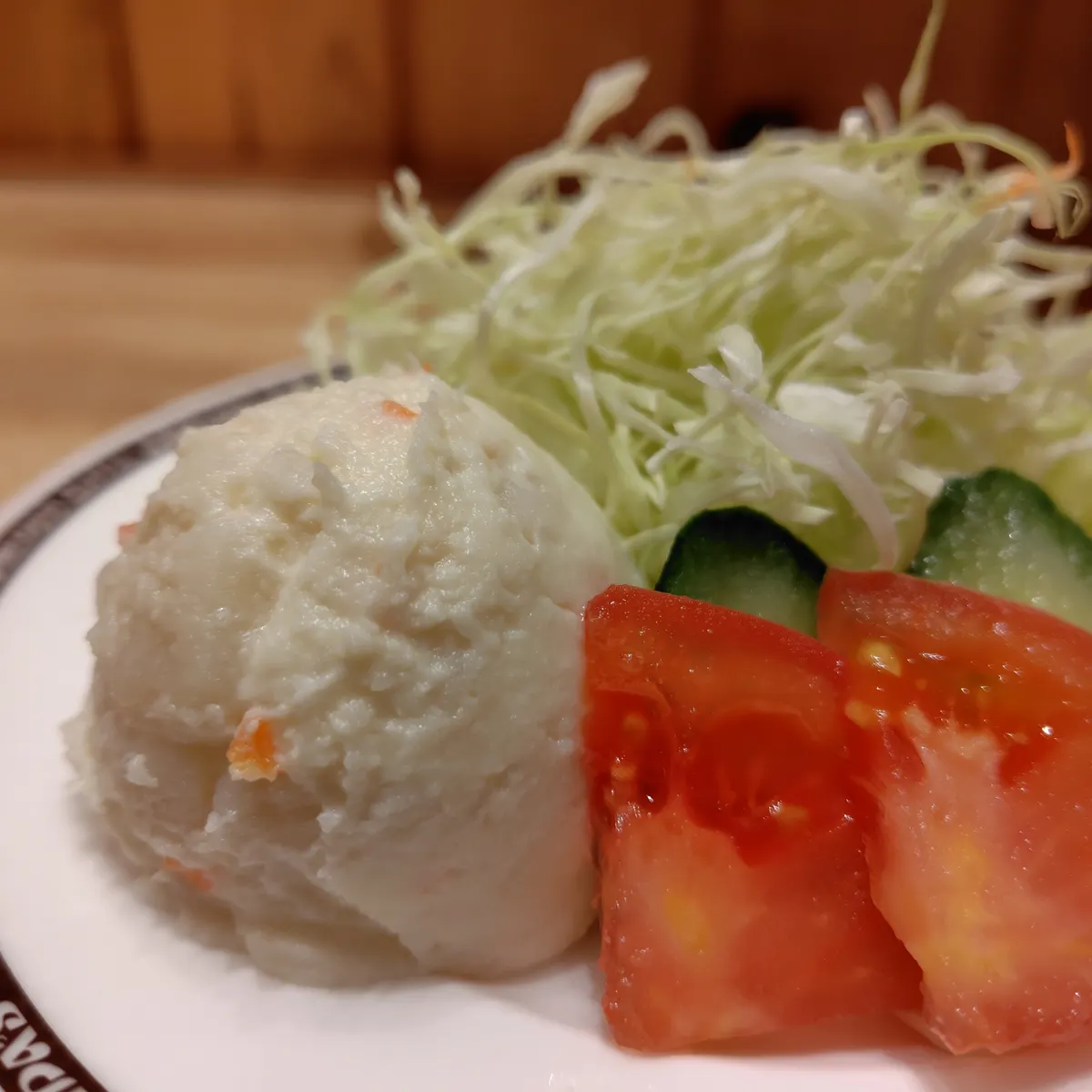 ミニサラダにポテチキ&たっぷりのケチャップ、美味しそうですね✨