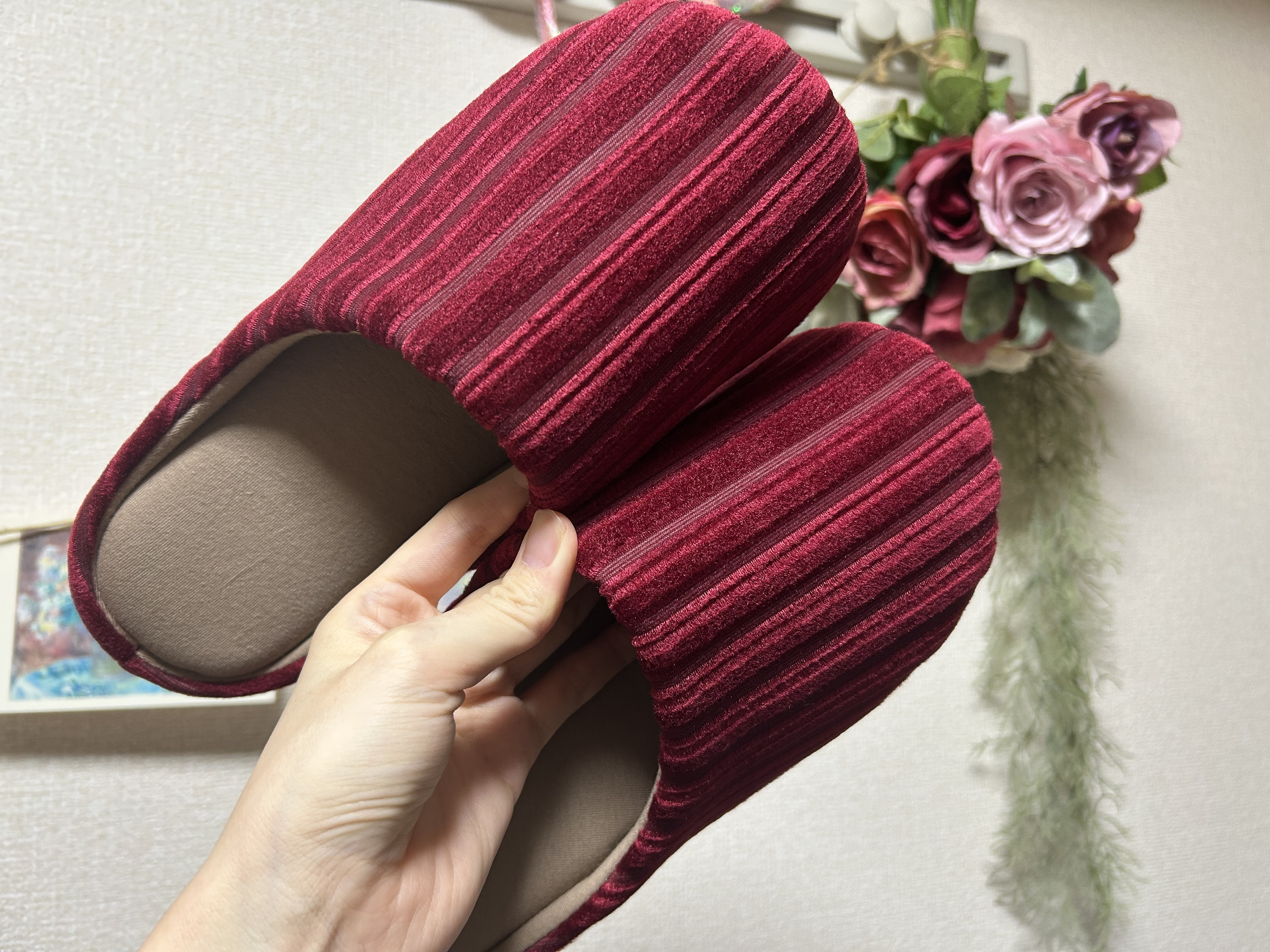 赤ソファー柄のスリッパ、素敵ですね💓優しい色合いでお家にも馴染みそうですね☺️