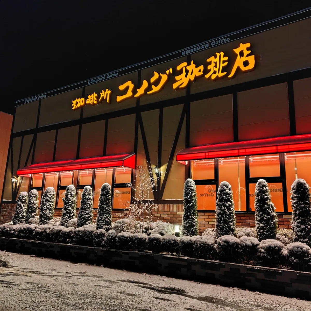 雪景色のコメダ珈琲店の夜景、ひと足先にホワイトクリスマス🎄みたいでとても綺麗ですね😍🎶