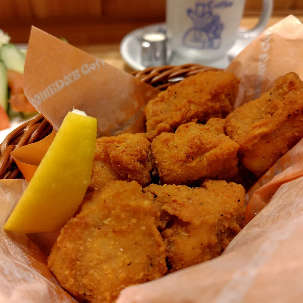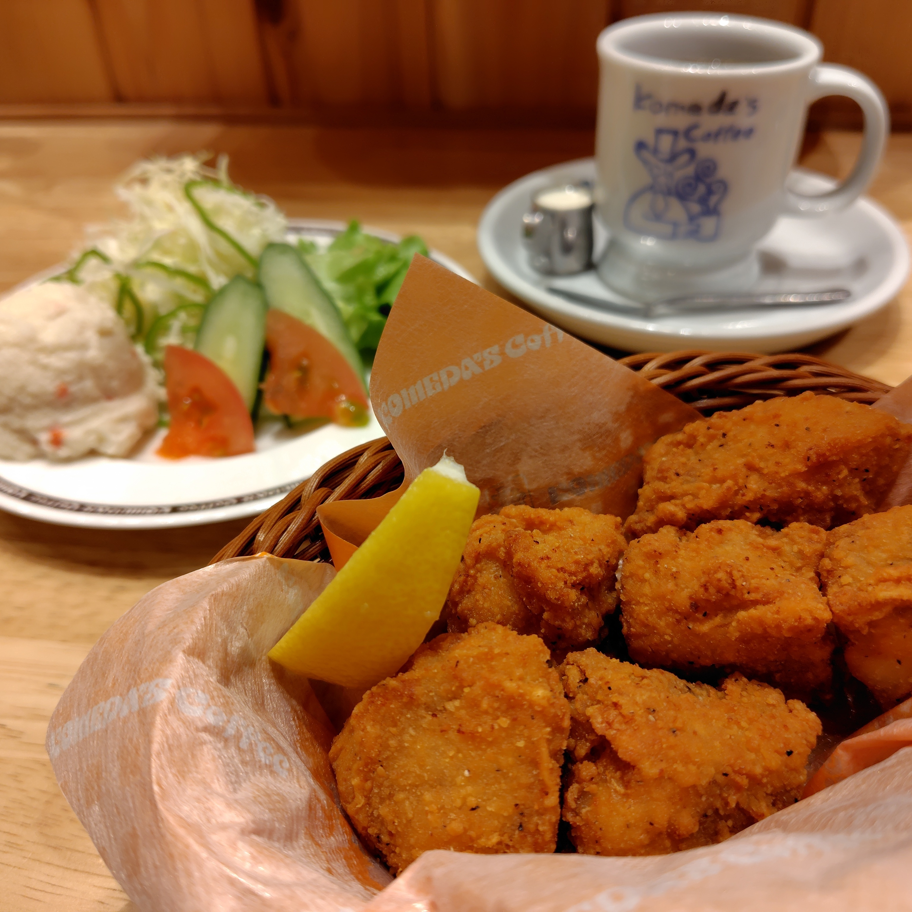 熱々コメダブレンドとコメチキとミニサラダ🥗の組み合わせ、とっても美味しそうです〜🤤❤️✨