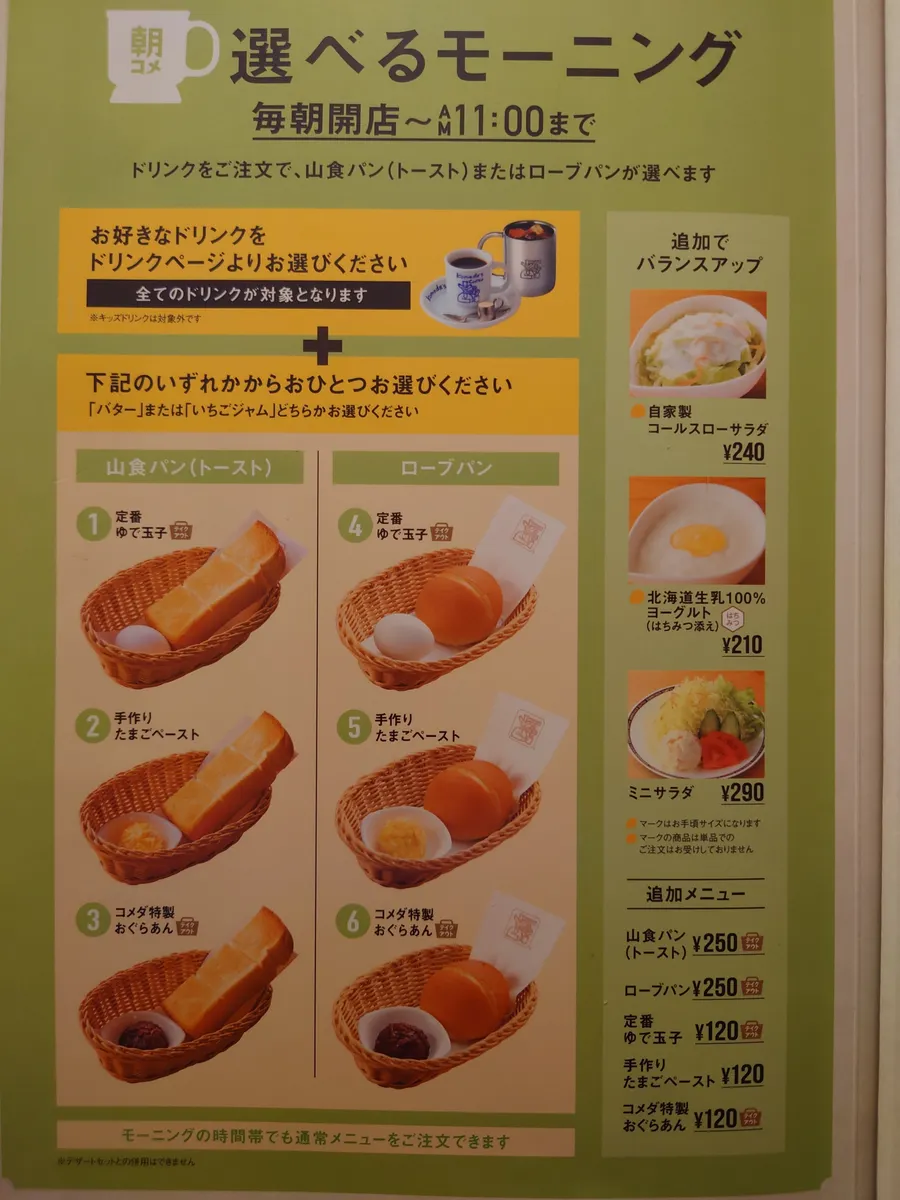 モーニングの時にコーヒーも頼んだら、モーニング付けますか?と質問されたので、ちょっと食べ過ぎかと、思ってコーヒーはキャンセルしてもらいました。モバイル注文だったので、出来ないと言われたら、モーニング無しにしようか迷いましたが、一応注文出来たのでホッとしました。