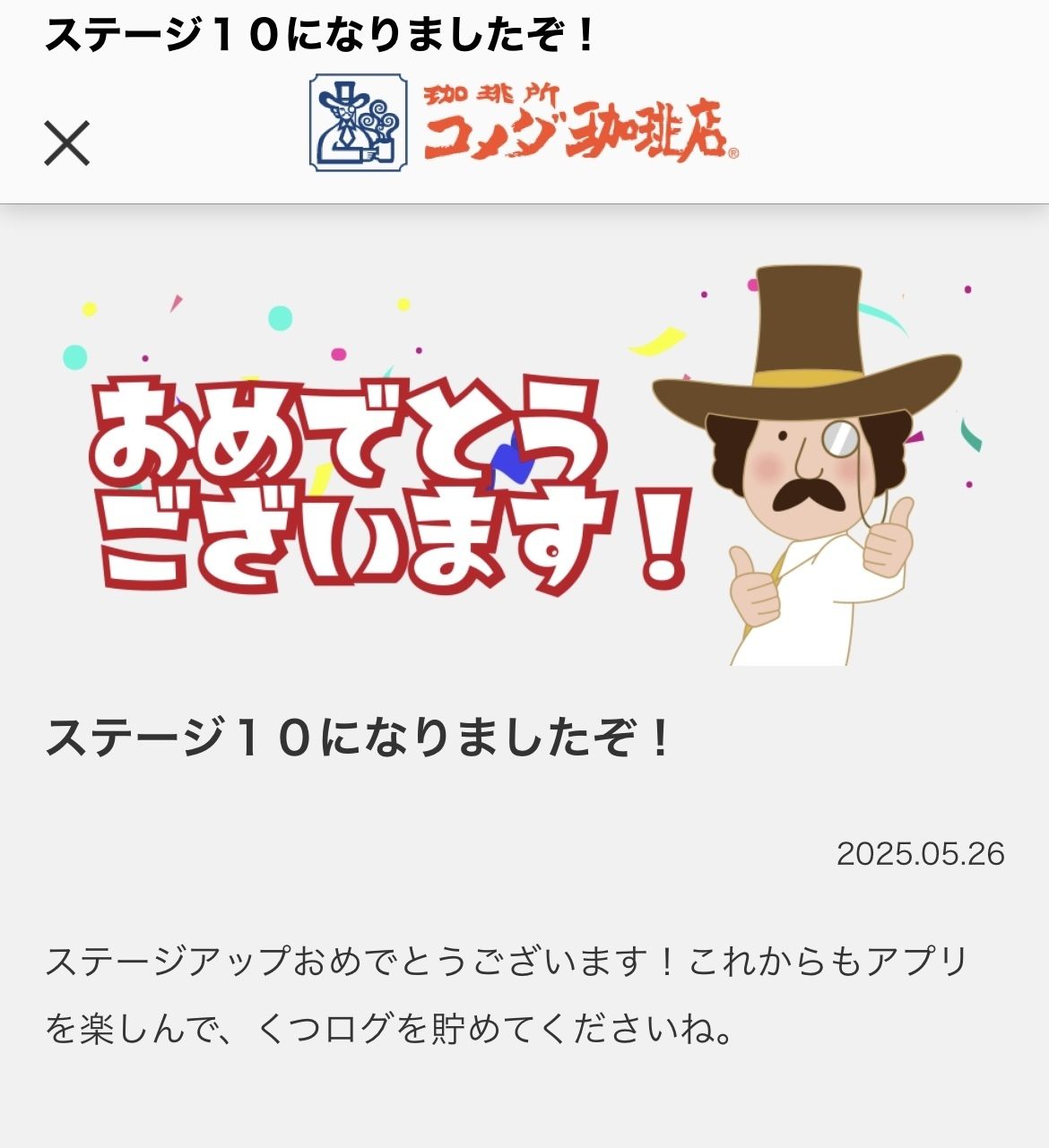 トップ > コメダ写真館 > ステージが… たぁーにゃん 2025/05/26 15:20 ステージが… コメダアプリいじってたら知らぬ間にステージが上がってました いいね 共有する 共有する X facebook LINE リンクをコピー コメントする 3 件の返信 (新着順) ミュートしたユーザーの投稿です。 投稿を表示 いちじく 2025/05/27 19:40 たぁーにゃん たぁーにゃんさん🎉ステージ10おめでとうございます👏 いいね 返信する ミュートしたユーザーの投稿です。 投稿を表示 やっちゃん 2025/05/26 23:18 素晴らしい👍 いいね 返信する ミュートしたユーザーの投稿です。 投稿を表示 HIRO 2025/05/26 19:37 たぁーにゃん やったがね👍 いいね 返信する