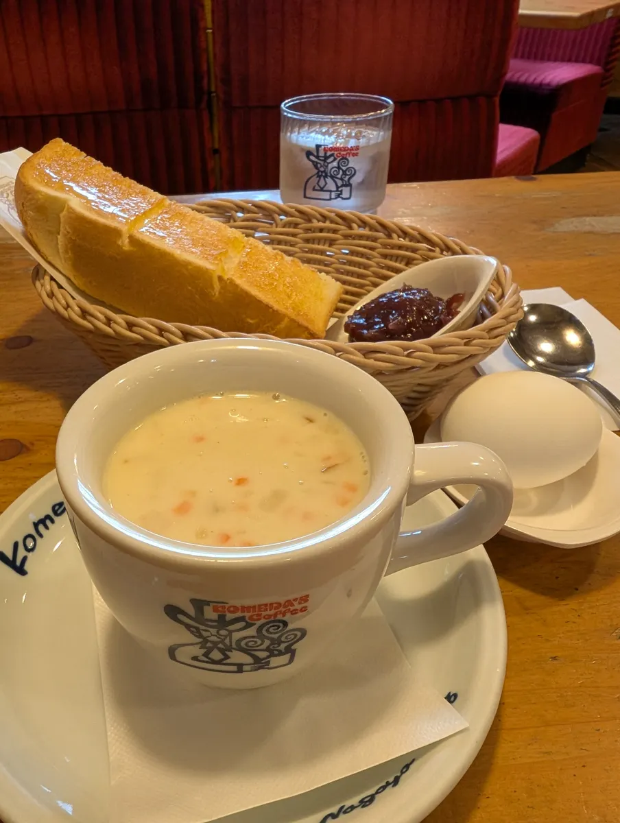 今日のモーニングは、クラムチャウダー+3番モーニング(マーガリン)+ゆでたまご