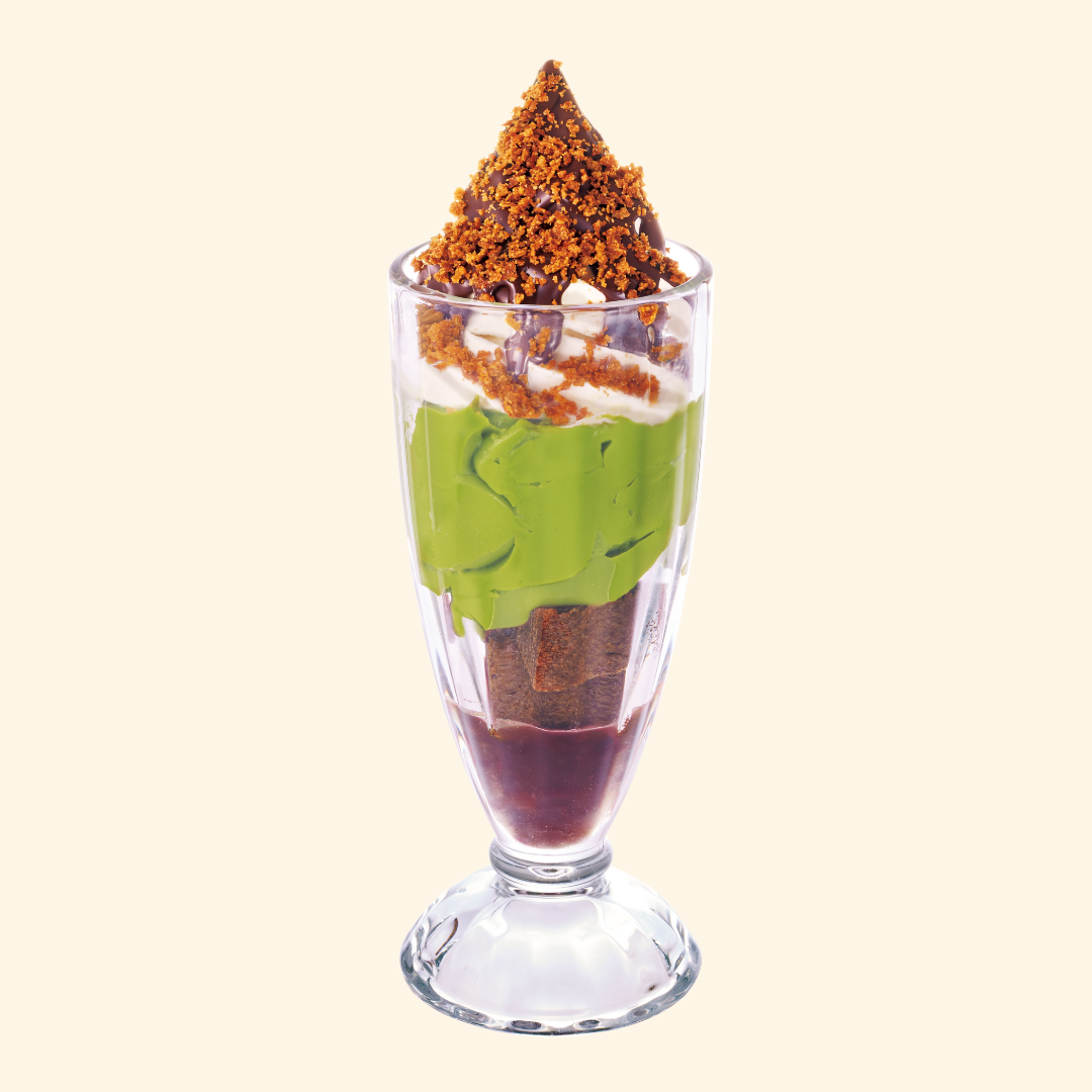 グラスの一番下には小倉あんとココアバウムクーヘンを合わせ、和と洋のハーモニーを演出。その上に祇󠄀園辻󠄀利の宇治抹茶を使ったプリンを重ねました。一番上のソフトクリームには、“パリッと食感のチョコソース”と“ザックザク食感のクランチ”をかけ、ブラックモンブランの魅力を再現しました。チョコソースの甘みと抹茶のほろ苦さがちょうどよく調和して、食べ進めるごとに違う味と食感が楽しめます。