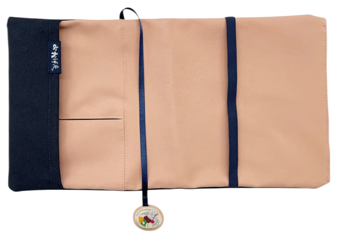 こちらが小豆染めのブックカバーです。淡いピンク色に、紺色のしおりが映えます。しおりにはおかげ庵のクリームあんみつが付いています。