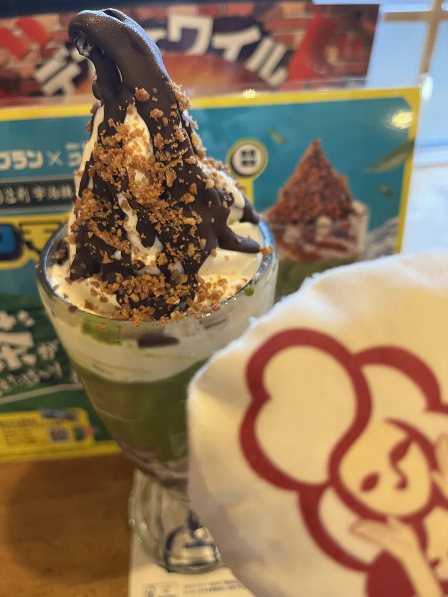 底から小倉あん・ココアバウムクーヘン・宇治抹茶プリン🍮・ソフトクリームと積み重ね、クランチとチョコソースのトッピングをあしらった本格和風パフェでした💓