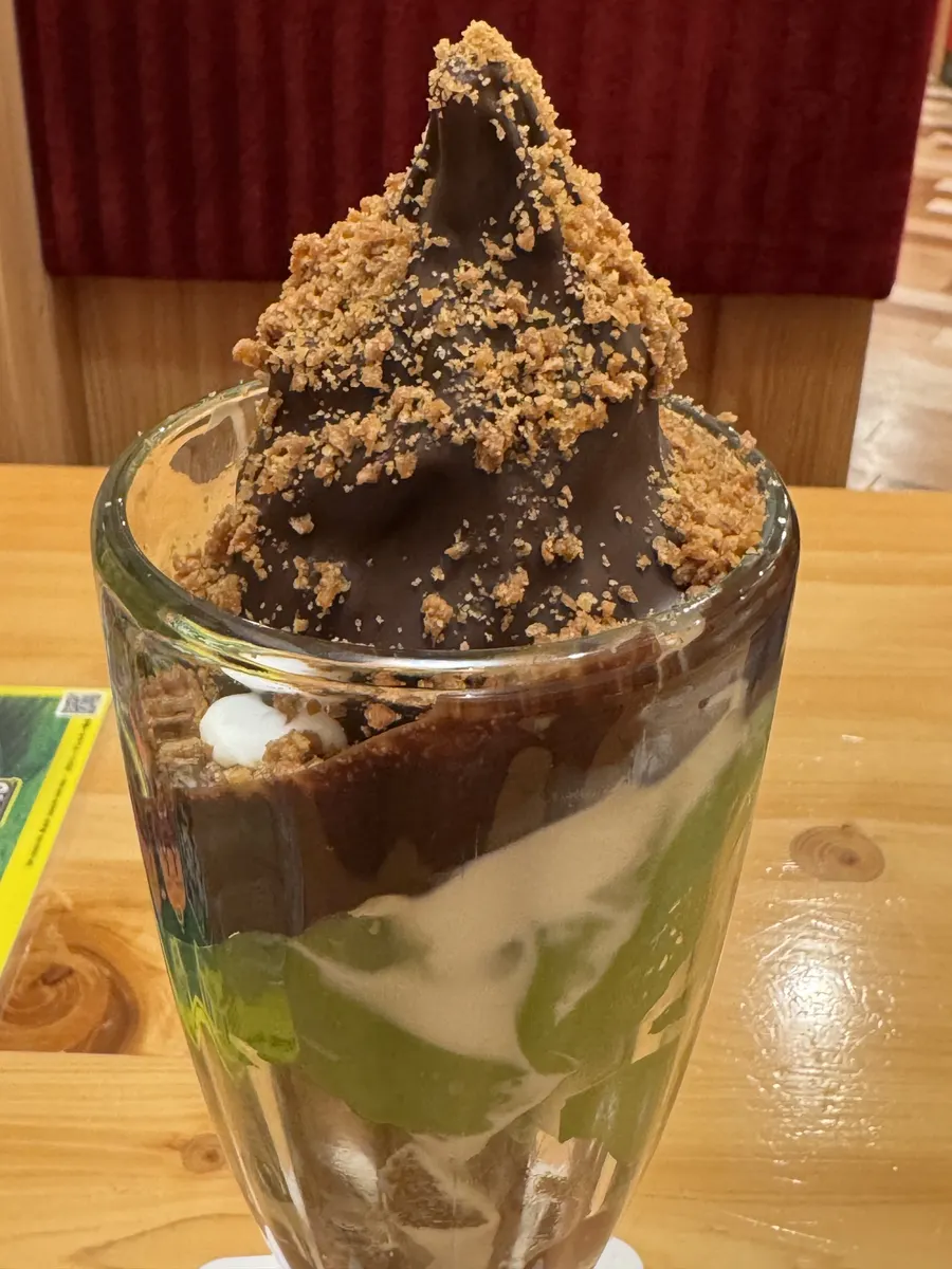 朝のデザートパフェはソフトクリームの白が目立っていたから、夜パフェは一層茶色と緑色が際立って見えました❣️