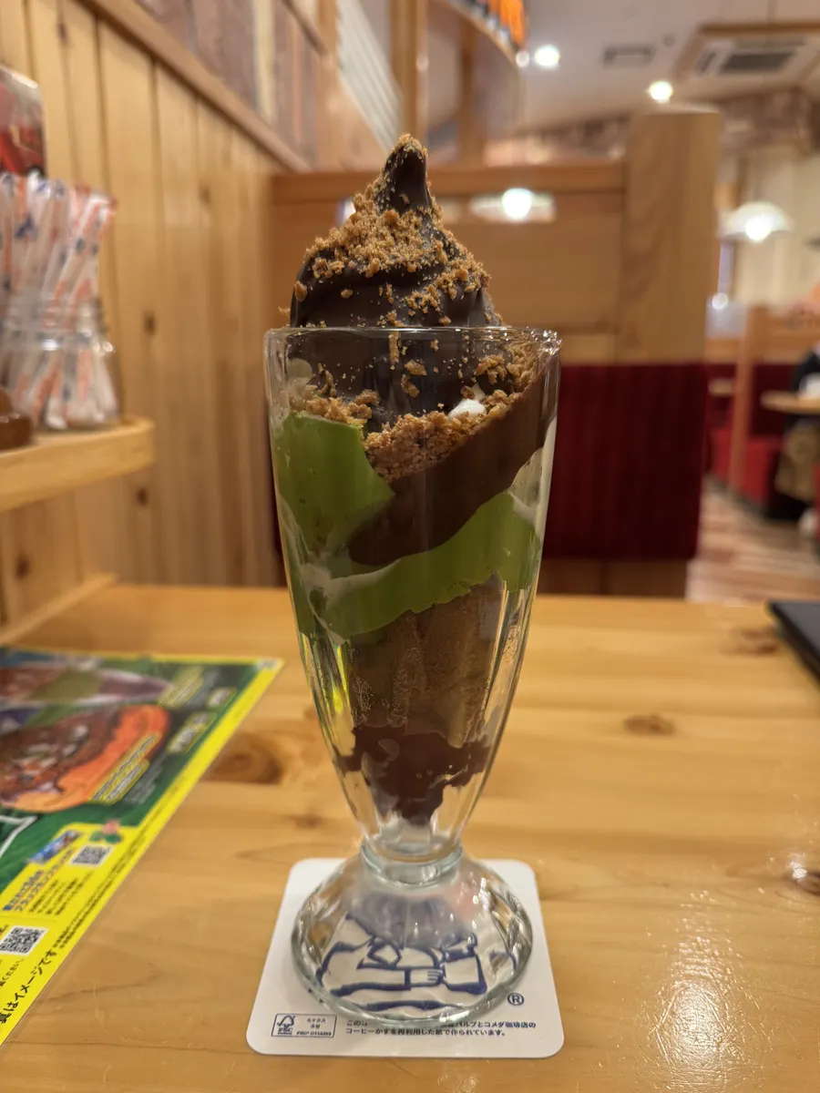 でも、そんな残念な気持ちを吹き飛ばすような、まるでブラックモンブランアイスを食べているようなザクザクパリパリ感と、祇園辻利で抹茶プリンを食べているようなソフトクリームの下のパフェで最高に美味しかったです🎶