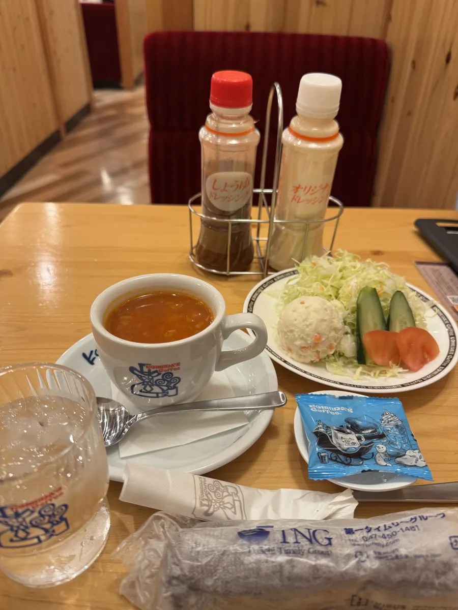 ミネストローネとミニサラダ🥗、アキさんの投稿でゴン太君が美味しそうにオススメしてくださっているので、勝手に『ゴン太君のオススメランチ』と呼んでおります😊。